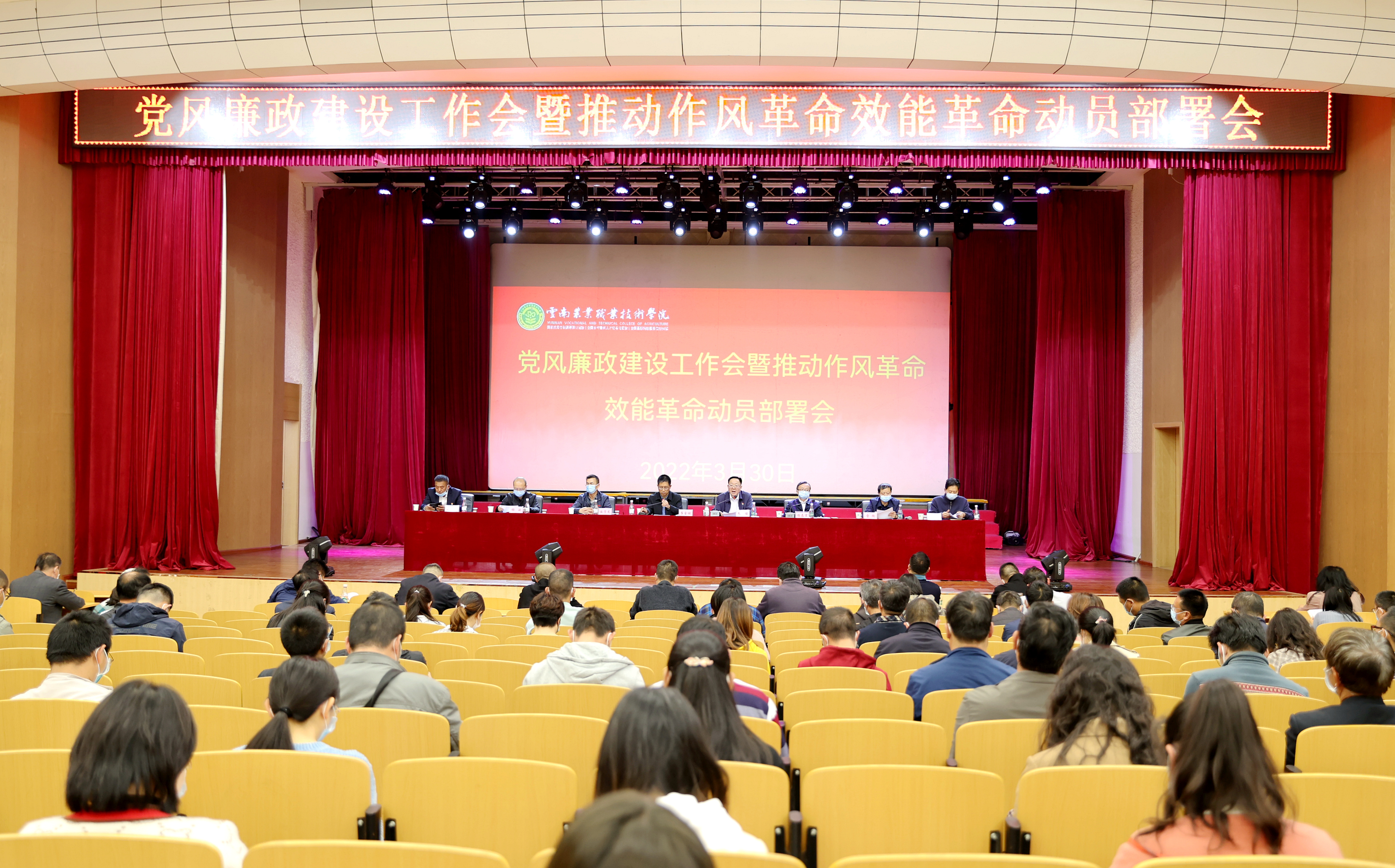 通知中心3月30日下午,根據學院黨委工作安排,在小哨校區蠶桑禮堂召開了2022年云南農業職業技術學院黨風廉政建設工作會暨推進作風革命效能革命動員部署會。參加會議的有學院黨政領導,全體副科級及以上領導干部,紀委委員,各支部書記、紀檢委員,會議由院長文俊同志主持。