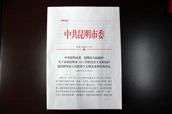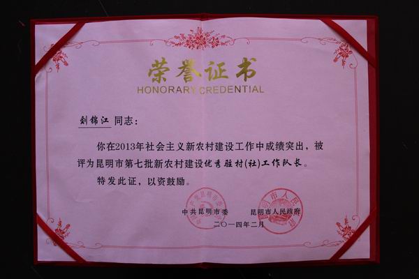 劉錦江同志被表彰為“2013年度昆明市新農村建設優秀駐村(社)工作隊長”