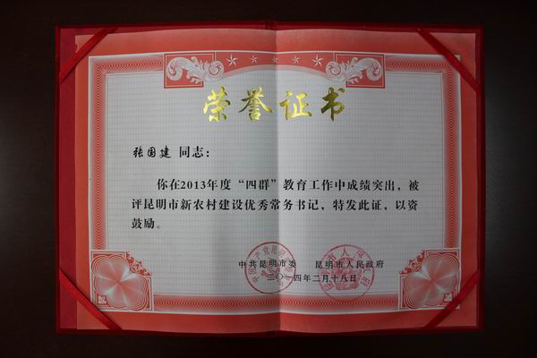 張國建同志被表彰為“2013年度昆明市新農村建設優秀常務書記”