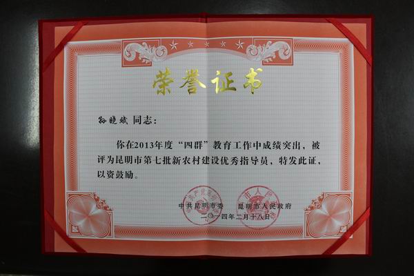 孫曉斌同志被表彰為“2013年度昆明市第七批新農村建設優秀指導員”