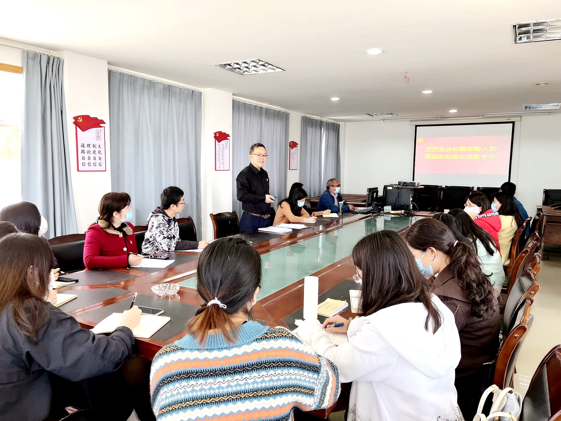 他強調,所有的任課教師要“讀原著、學原文、悟原理”,把黨史上的三個決議精神特別是黨的十九屆六中全會通過的決議精神融入到課程建設中,做好黨的最新理論成果進學生頭腦的各項工作。