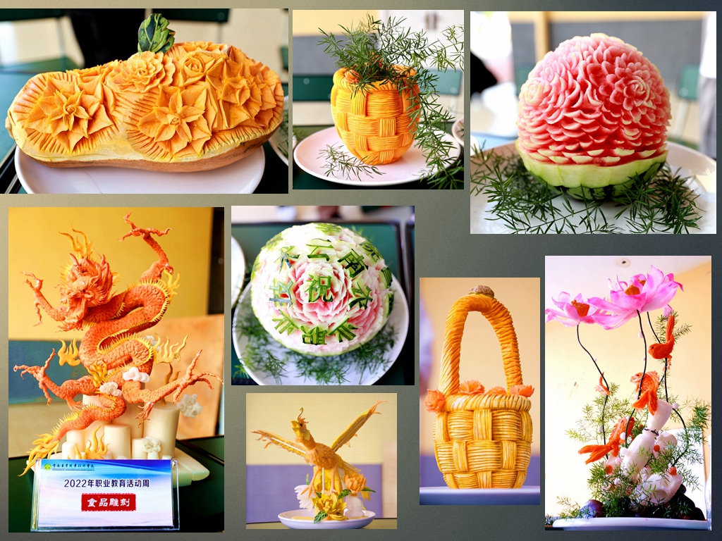 食品藥品與大健康學院展區,烹調班的同學展示了食品雕刻,精湛的雕刻功底讓平平無奇的蔬菜瓜果變成栩栩如生的藝術品;藥品班的同學則是展示醫療器械的規范操作流程,并在現場幫助同學們測量血壓和血糖,講解健康小知識。