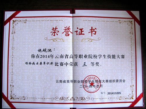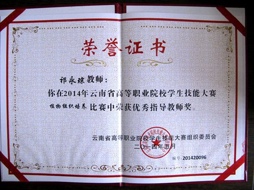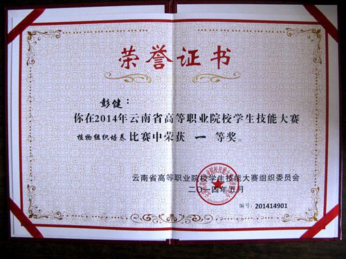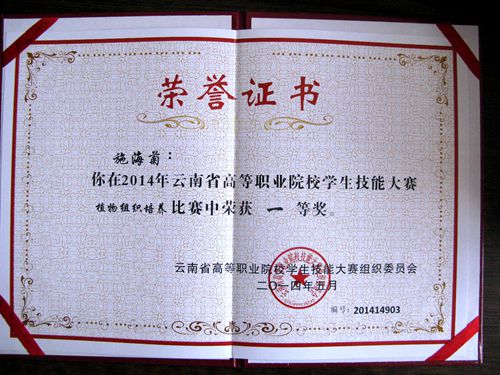 5月15日下午,2014年云南省高等職業院校學生技能大賽在昆明工業職業技術學院舉行頒獎儀式,我校園林園藝學院學生在競賽中表現出色,再創佳績,喜獲一等獎兩項、三等獎一項。彭建、施海菊、張應瓊、楊子芳四位同學代表學院參加的“植物組織培養”團隊項目的比賽中,冷靜應對、協同配合,最后獲得了該項目的一等獎。施硯池同學代表學院首次參加“植物病蟲雜草識別”項目比賽,獲得了該項目的三等獎。祁永瓊老師獲得“優秀指導教師獎”。