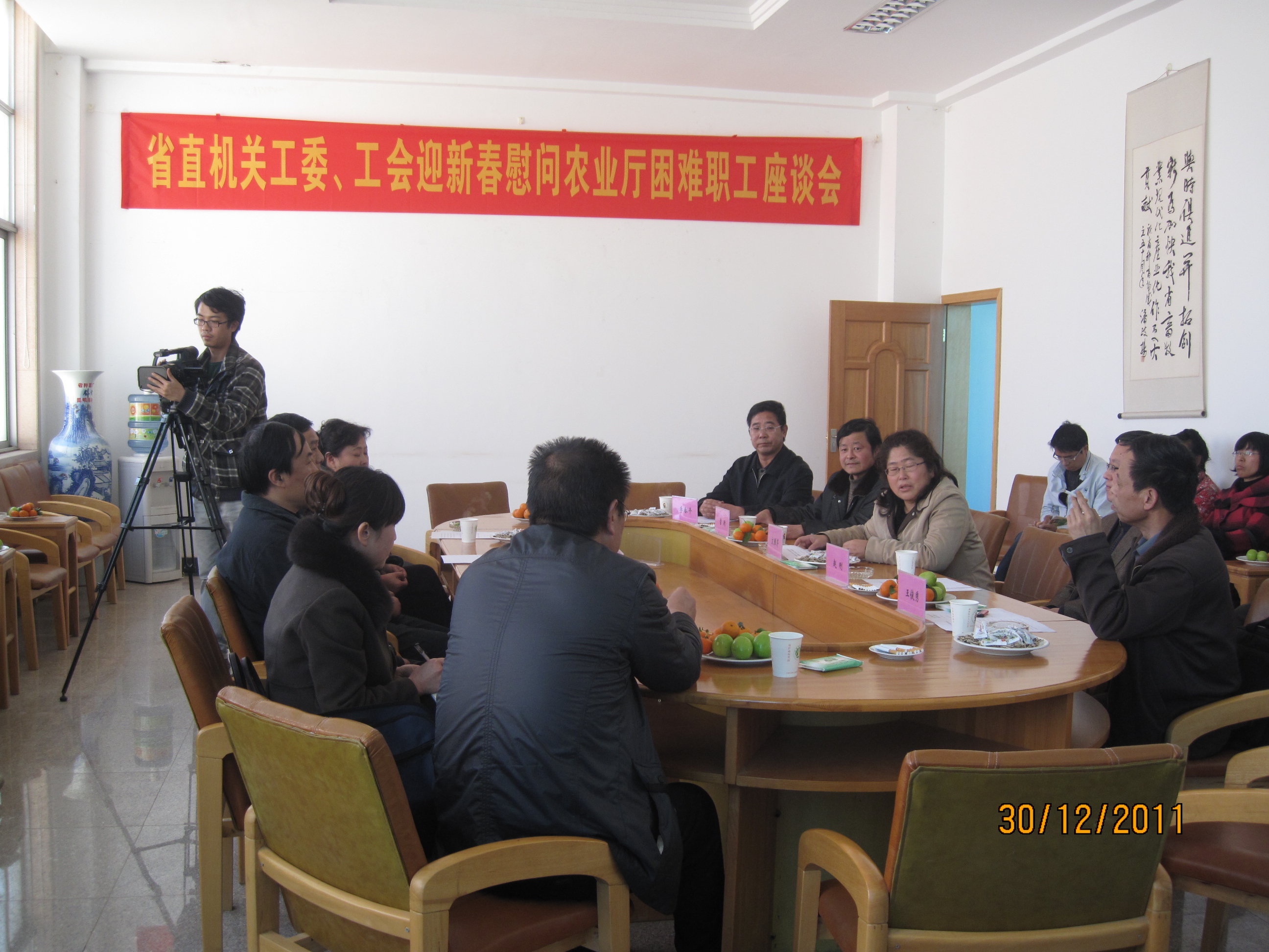 通知中心2011年12月30日下午,云南省直機關工委慰問農業廳困難職工座談會在小哨種畜場召開。省直機關工委副書記魯維星、農業廳機關黨委副書記王俊秀、農業廳副巡視員文雅芹、云南農業職業技術學院黨委副書記兼工會主席趙剛、省種畜場場長雷衡等10名領導出席了座談會。省直機關下屬單位等40余困難職工代表參加了座談會。
