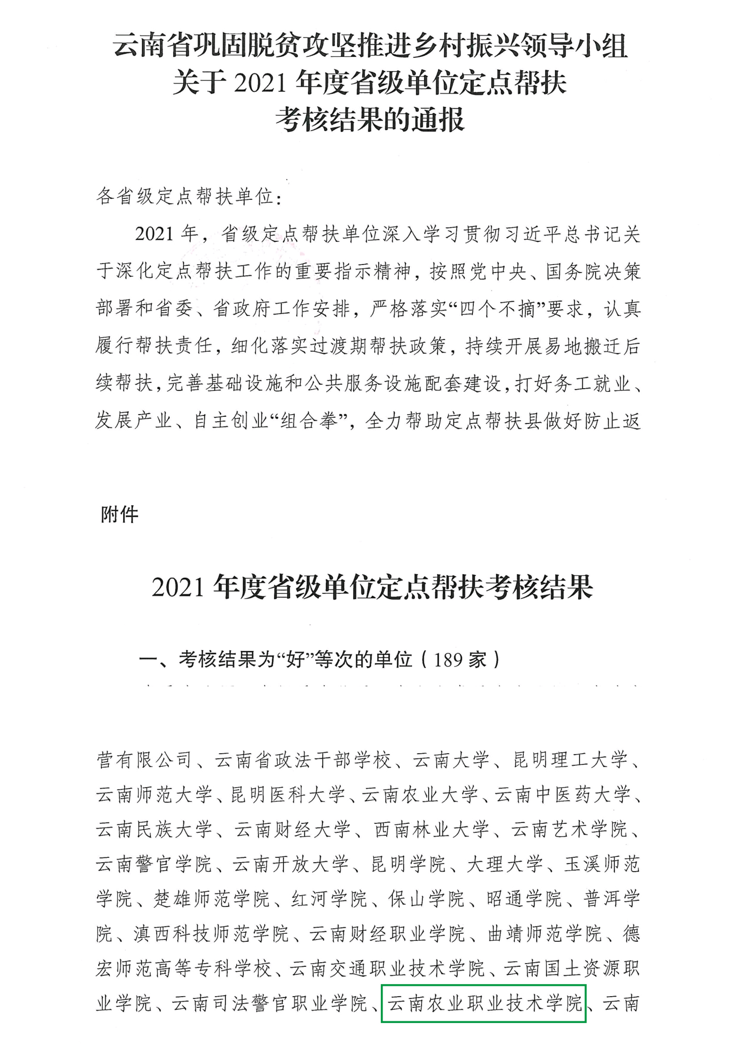 通知中心日前,云南省鞏固脫貧攻堅(jiān)推進(jìn)鄉(xiāng)村振興領(lǐng)導(dǎo)小組印發(fā)《云南省鞏固脫貧攻堅(jiān)推進(jìn)鄉(xiāng)村振興領(lǐng)導(dǎo)小組關(guān)于2021年度省級單位定點(diǎn)幫扶考核結(jié)果的通報(bào)》,此次考核共評選出“好”等次省級定點(diǎn)幫扶單位189家,“較好”等次省級定點(diǎn)幫扶單位12家。其中,我院榮獲2021年度省級單位定點(diǎn)幫扶考核“好”等次。