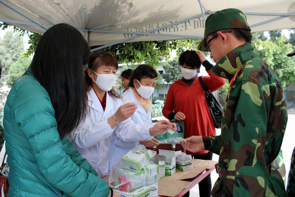 為此,學(xué)院軍訓(xùn)領(lǐng)導(dǎo)小組、駐訓(xùn)教師根據(jù)預(yù)案組織軍訓(xùn)醫(yī)療小分隊,由駐訓(xùn)工作小組副組長紀(jì)杰副處長、張玉梅醫(yī)生到軍訓(xùn)現(xiàn)場為生病和受傷的同學(xué)一一診療,其它老師則負(fù)責(zé)攙扶幫助傷病學(xué)生,并把藥品分裝與發(fā)放。