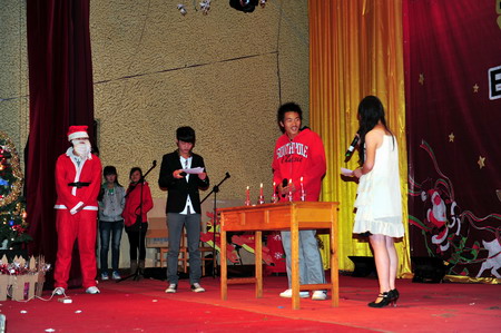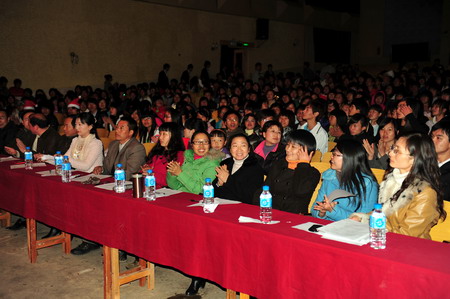 通知中心晚會(huì)邀請(qǐng)到了教務(wù)處楊有昌處長(zhǎng)、園藝與園林工程系黨總支唐世凱書(shū)記、畜牧獸醫(yī)系黨總支錢(qián)林東書(shū)記、宣傳部蔡永生副部長(zhǎng)、生物工程系團(tuán)總支張梅書(shū)記、管理與信息工程系團(tuán)總支黃建偉書(shū)記等領(lǐng)導(dǎo)以及云南林業(yè)職業(yè)技術(shù)學(xué)院、云南交通職業(yè)技術(shù)學(xué)院和云南醫(yī)學(xué)高等專(zhuān)科學(xué)校三所兄弟院校的學(xué)生代表,學(xué)生工作處周誠(chéng)處長(zhǎng)、施碧強(qiáng)副處長(zhǎng)、基礎(chǔ)部李憬副主任也出席了圣誕晚會(huì)。