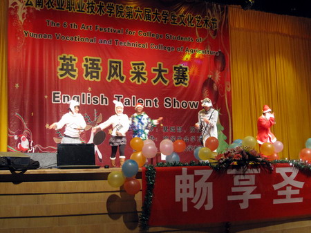 此次大賽由基礎(chǔ)部和院團(tuán)委聯(lián)合主辦,院學(xué)生會(huì)學(xué)習(xí)部承辦,以“暢享圣誕之英,展我農(nóng)職風(fēng)采”為主題。經(jīng)過(guò)長(zhǎng)達(dá)兩個(gè)多月的精心組織和充分準(zhǔn)備, 20個(gè)優(yōu)秀節(jié)目從兩個(gè)校區(qū)初賽的46個(gè)節(jié)目中脫穎而出進(jìn)入決賽,并同時(shí)作為圣誕晚會(huì)的表演節(jié)目在圣誕前夕和新年到來(lái)之際呈現(xiàn)給老師和同學(xué)們。