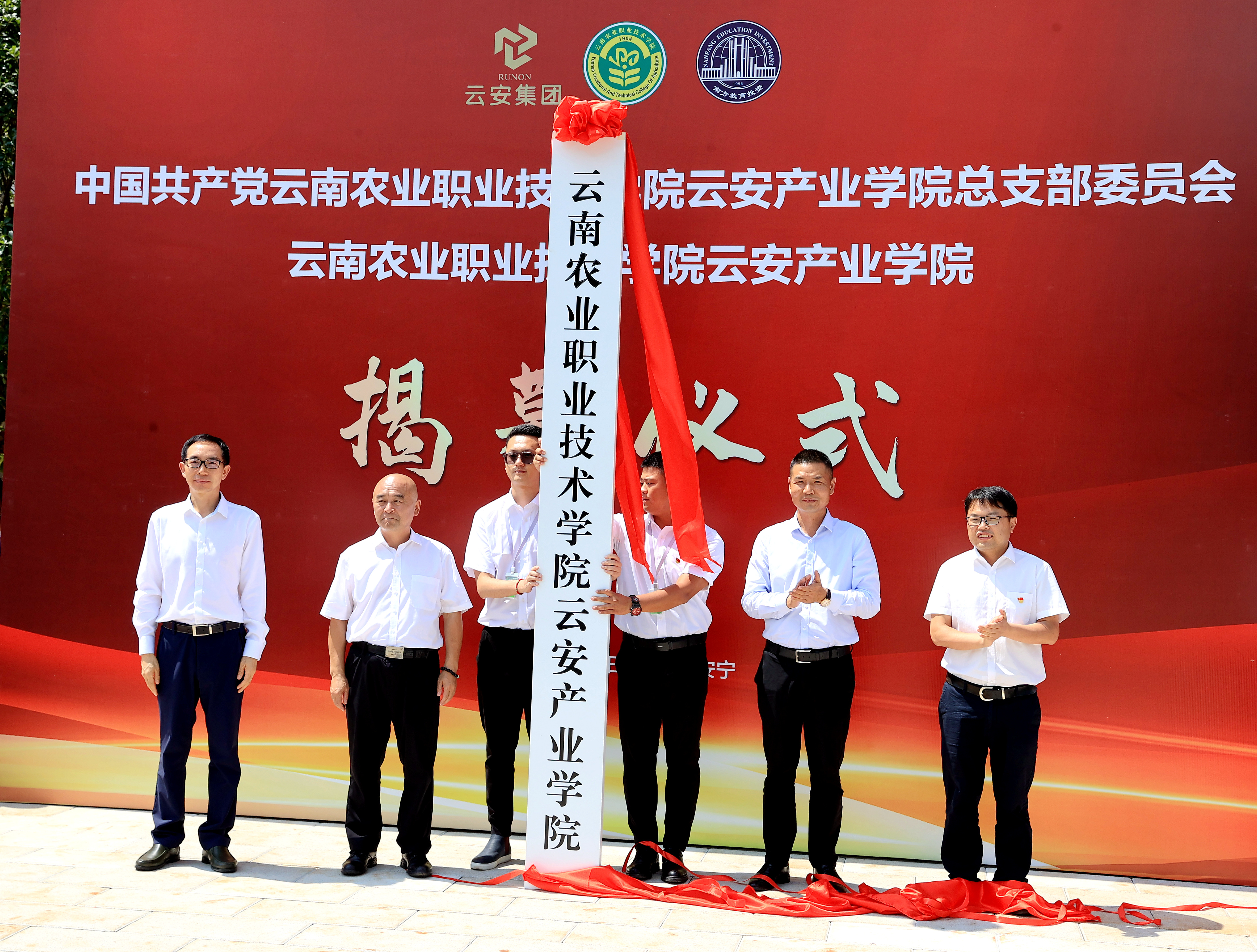 學院黨委書記文俊、院長陳太安為“云南農業職業技術學院”校名揭幕;學院黨委副書記伍學龍、紀委書記馮志宏為云安產業學院黨總支部揭牌;學院院長陳太安、安寧市副市長李琦、云南云安投資集團董事長蘇國輝、云南南方教育投資集團董事長蘭靖共同為云安產業學院揭牌。安寧市金方街道辦事處有關負責人、云南云安投資集團總經理李艾奚、云南云安建筑公司總經理李永誠;學院黨委委員、辦公室(黨委巡察辦)主任夏體韜及學院有關職能部門負責人、合作企業代表和云安產業學院教職工參加揭牌儀式,共同見證學院安寧校區暨云安產業學院落成正式投入使用。
