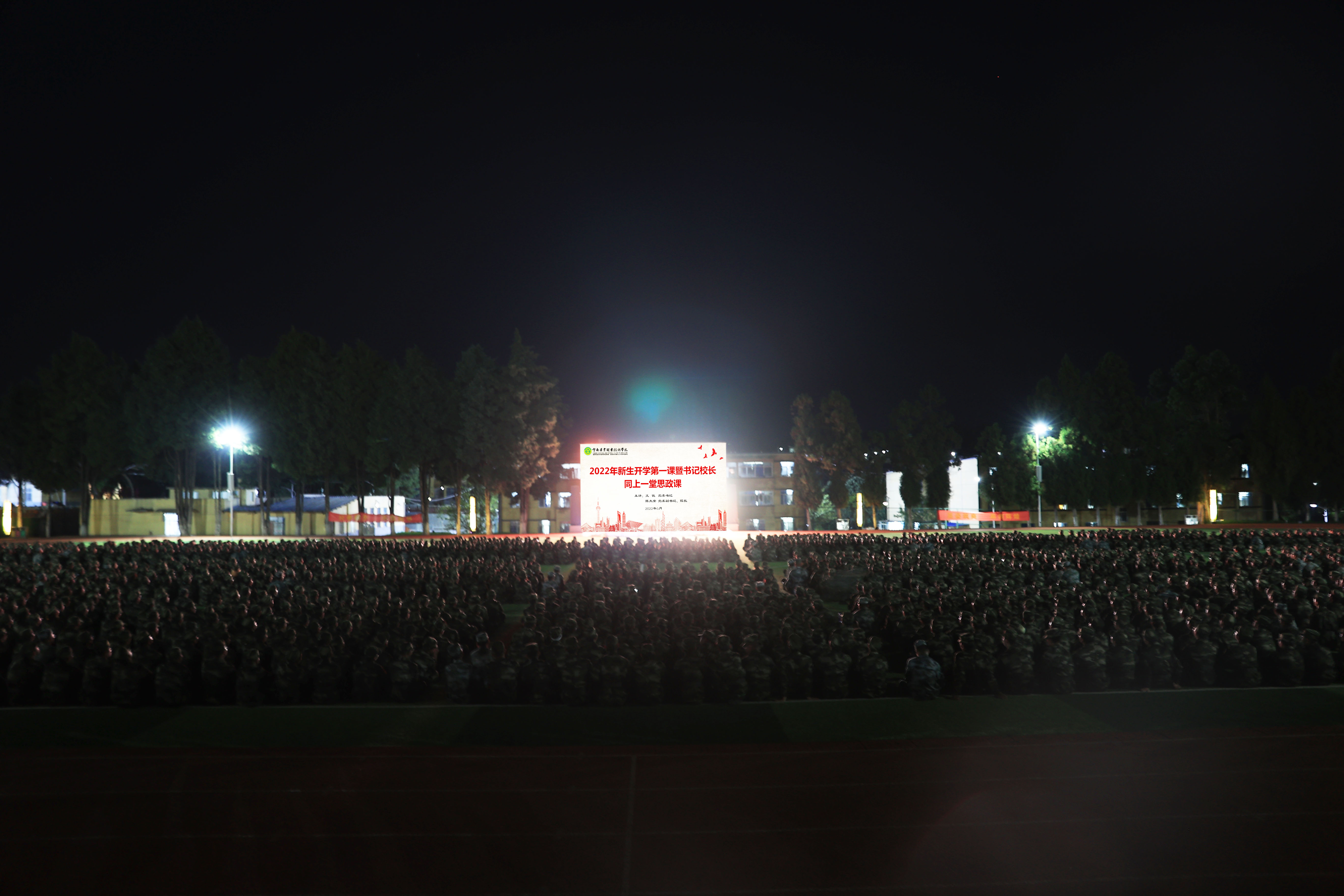 小哨校區3043名新生和軍訓教官共聚在足球場大屏前收看了授課視頻,茭菱校區與安寧校區的新生也將通過線上教學方式收看。(宣傳部/文:唐麗群/圖:顧李通/審核:楊筱瑩/責任編輯:唐麗群)