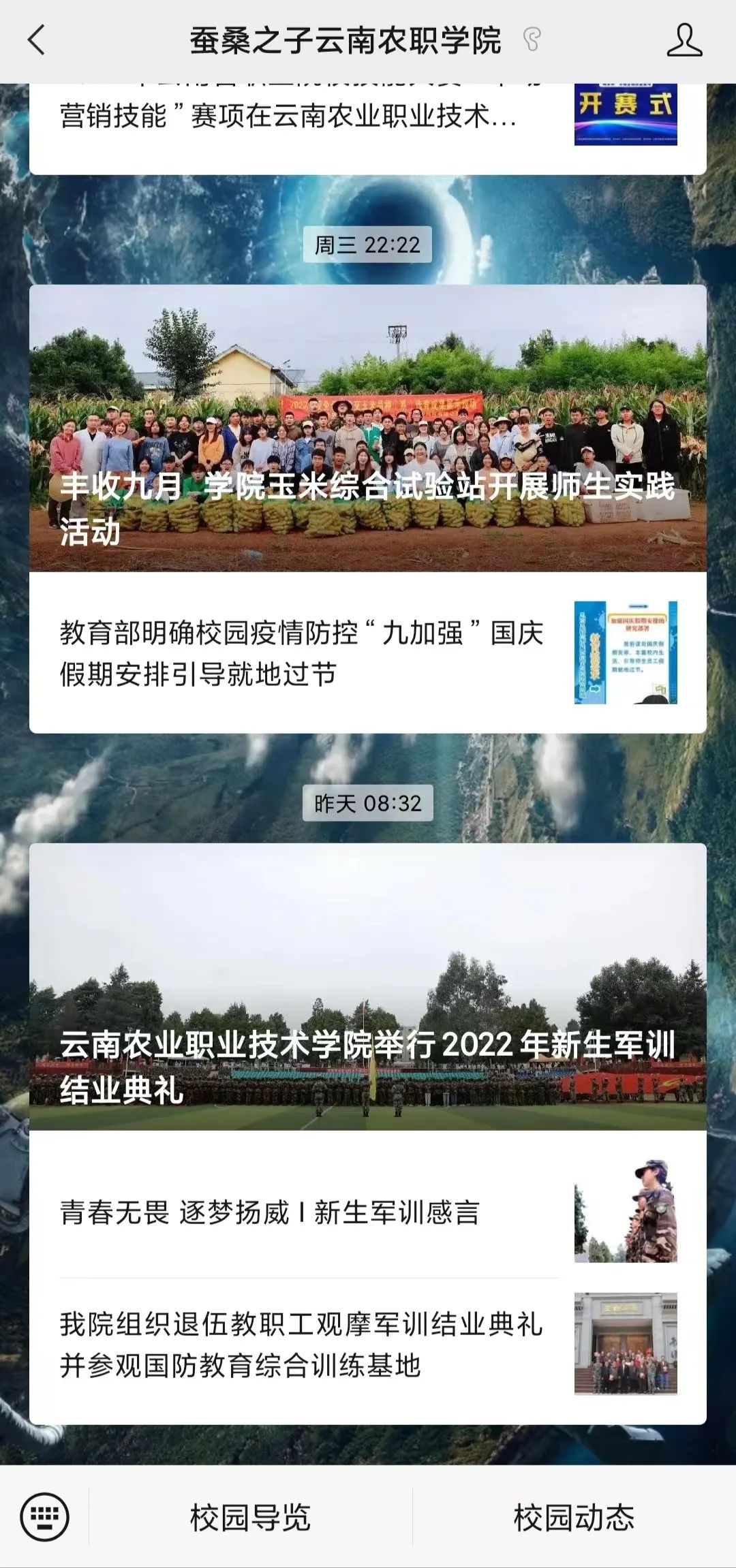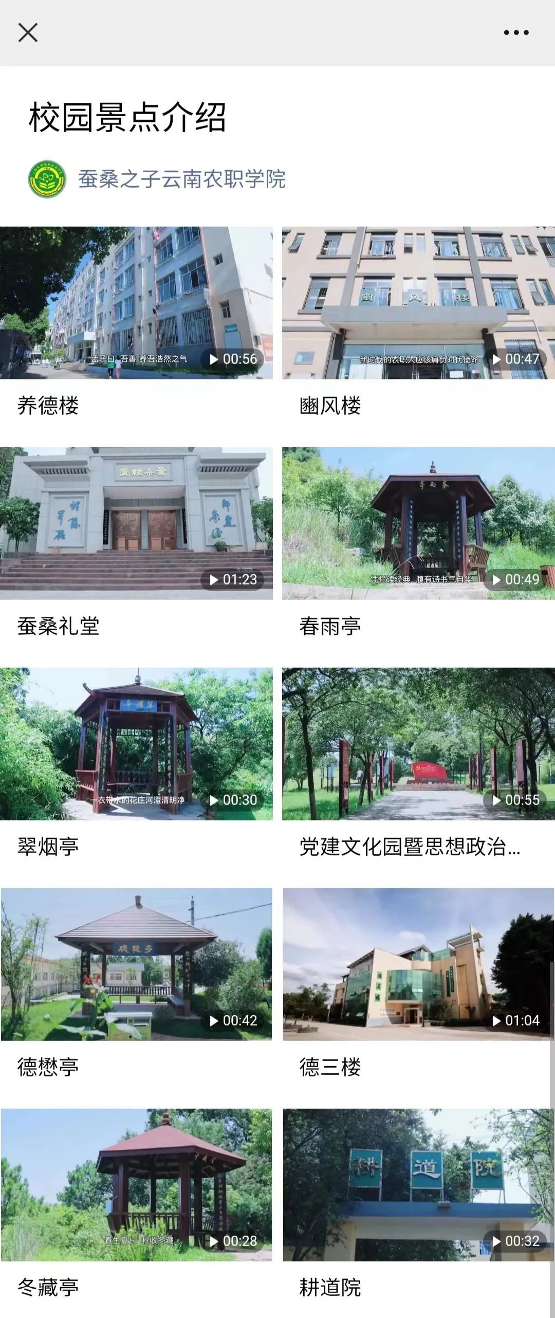打開“蠶桑之子云南農職學院”,點擊下屬菜單“校園導覽”,即可足不出戶領略校園風光,品味學院的歷史文化底蘊。
