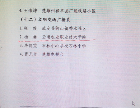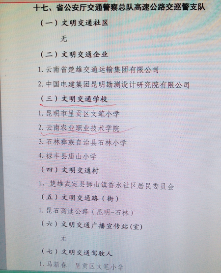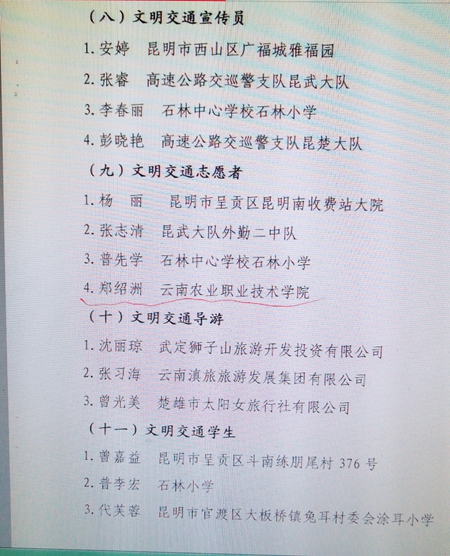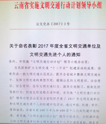 根據(jù)《云南省關(guān)于命名表彰2017年度全省文明交通單位文明交通先進(jìn)個人的通知》,在全省實施的“文明交通行動計劃”評選活動中,我院被評為2017年度全省文明交通單位。學(xué)院后勤服務(wù)中心主任鄭邵洲同志被評為文明交通志愿者;后勤服務(wù)中心綜合部部長楊琳同志被評為文明交通廣播員。