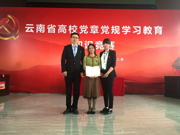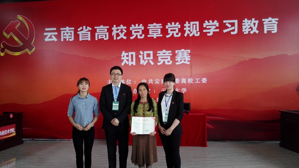 5月13日,全省高校黨章黨規學習教育知識競賽決賽在云南大學法學院舉行,在本科院校、高職高專學校、民辦高校共計15支強手緊張激烈的角逐中,我校代表隊以總分第9名的好成績最終榮獲二等獎!(黨委宣傳部供稿)