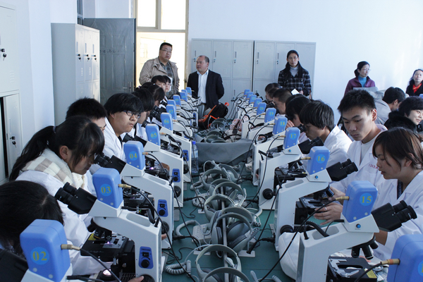畜牧獸醫系王銳老師的實驗課《雞、兔血涂片制作與觀察;活細胞的觀察》共分為兩個環節。先是制作涂片,然后再在互動電子顯微鏡下觀察細胞的形態。每一個步驟都要求學生認真細致地嚴格按照實驗要求來進行。在王老師的指導下,同學們順利完成了實驗任務,收到了良好的效果。