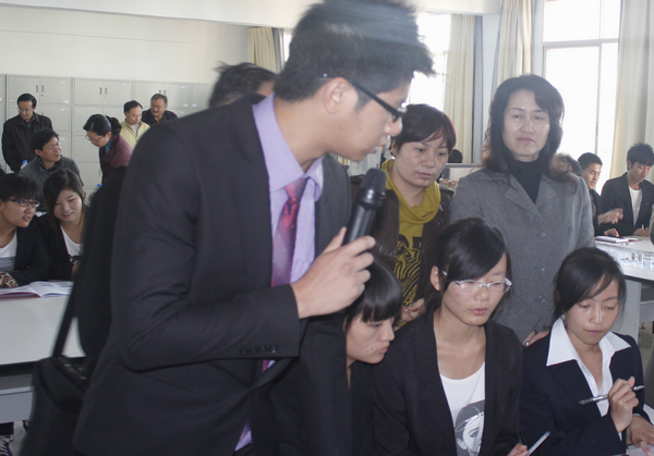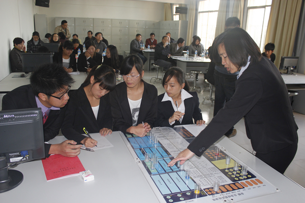 參加院級決賽的選手是在系部預賽中選拔出來的,各參賽教師精心準備,大展教學風采。管理與信息工程系教師郭正蓉在“ERP沙盤實訓室”講授《ERP沙盤模擬實訓》。該課程借助ERP沙盤,模擬了公司生產經營的整個過程。課上,同學們被分為多個小組,小組成員分別擔任公司的主要領導,解決公司在生產經營中遇到的各種問題。同學們積極討論,氣氛熱烈。通過模擬經營,提高了大家的觀察力、判斷力及邏輯思維能力。
