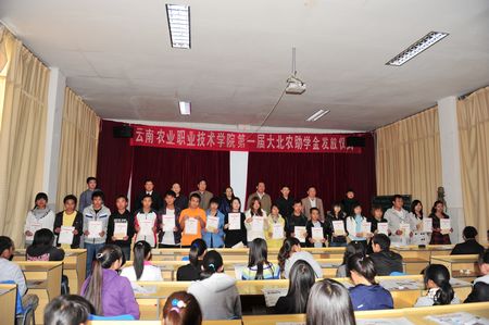 通知中心會議由畜牧獸醫系主任趙躍主持并講話,趙躍主任首先介紹了大北農集團十五年發展壯大為上市公司的成長歷程,大北農集團獨特而有活力的企業文化,強調人是企業最大的資源;介紹了我院畜牧獸醫系與昆明大北農農牧科技有限公司良好的校企合作過程,“大北農班”的同學在校企文化的熏陶訓練下,健康愉快地成長、成熟;介紹了大北農助學金資助大學生的目的:以興學助學為己任。趙主任強調大北農助學金在我院首次發放的意義,就是要資助既貧困又好學的學子順利完成學業,希望受助學子安心學習,用好成績回報企業、社會的關愛,學會感恩父母,感恩社會和學校!