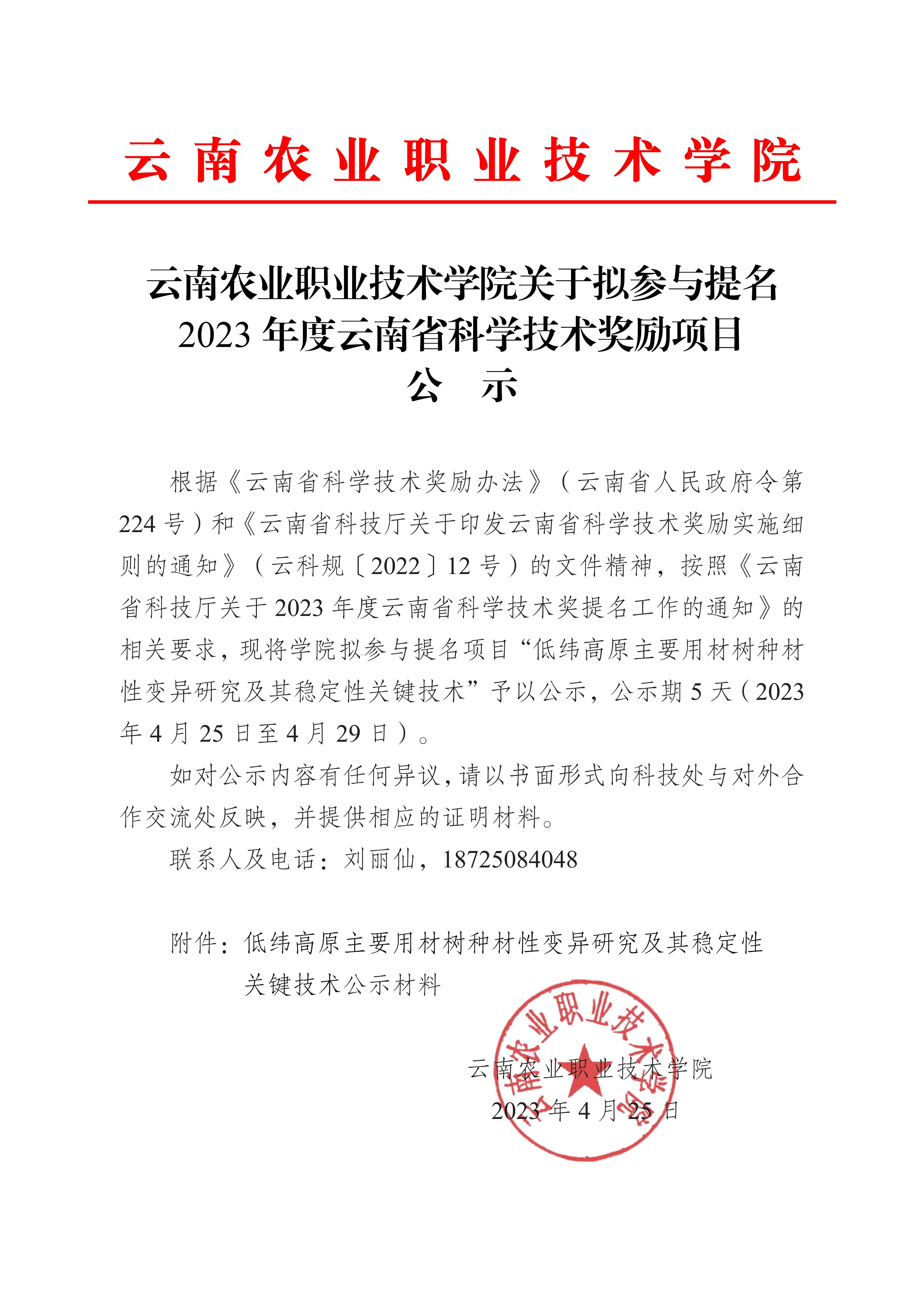 云南農(nóng)業(yè)職業(yè)技術(shù)學(xué)院關(guān)于擬參與提名2023年度云南省科學(xué)技術(shù)獎(jiǎng)勵(lì)項(xiàng)目公示