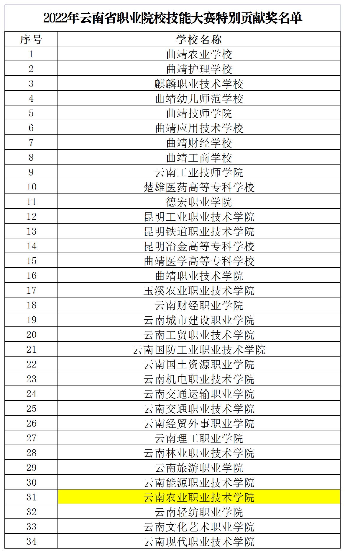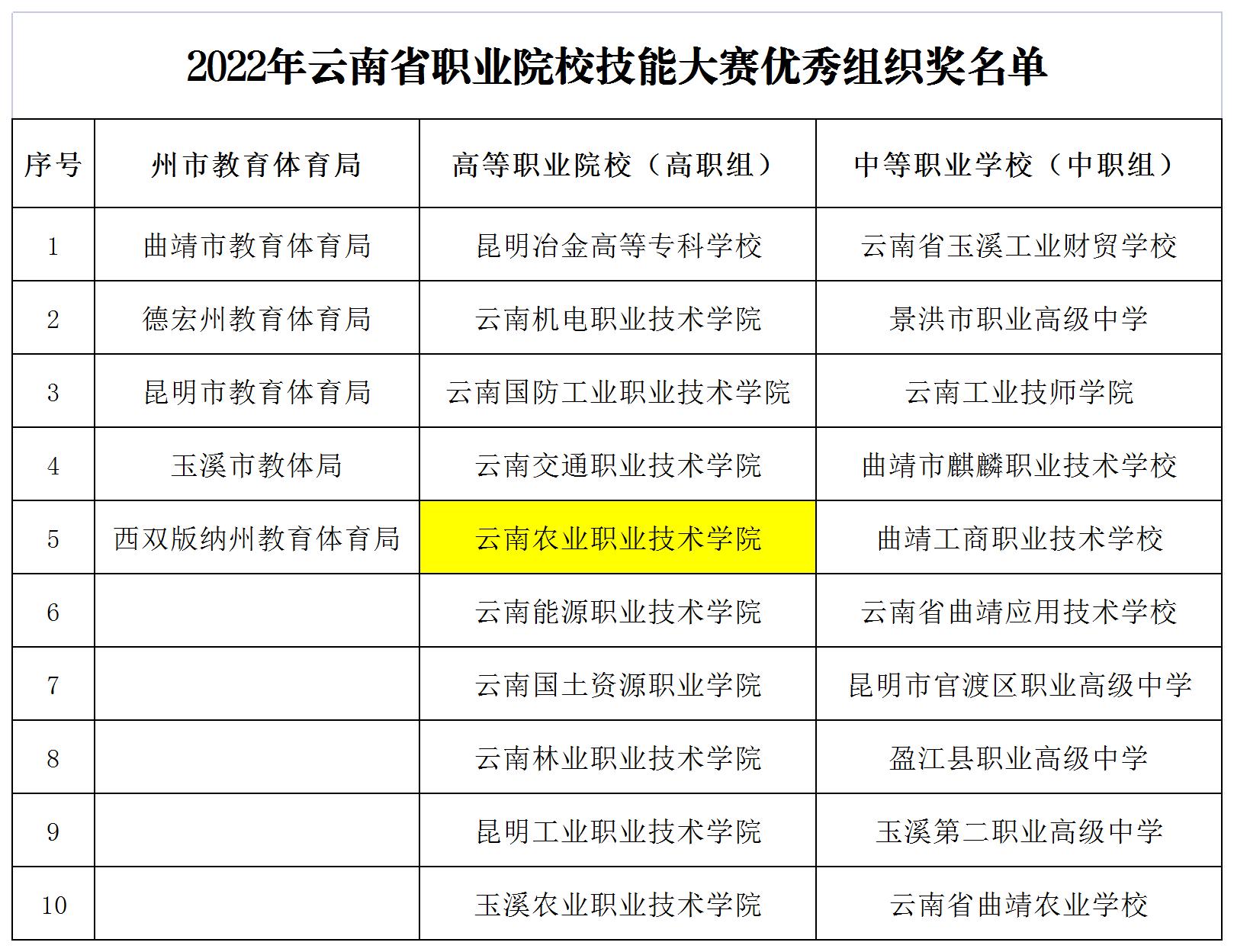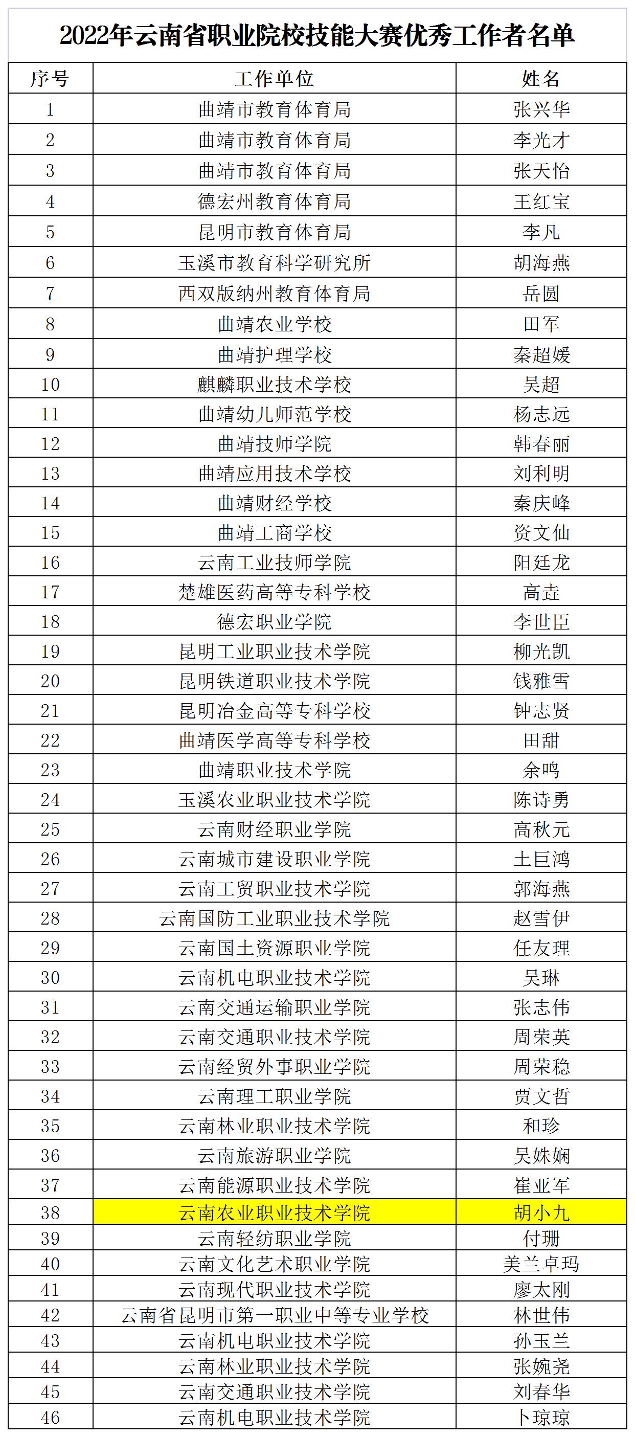 通知中心近日,云南省教育廳公布了《關(guān)于2022年云南省職業(yè)院校技能大賽中職組和其他獎(jiǎng)項(xiàng)獲獎(jiǎng)名單的通知》,2022年云南省職業(yè)院校技能大賽中職組68個(gè)賽項(xiàng)和高職組2個(gè)賽項(xiàng)已全部完成比賽。經(jīng)評(píng)審、公示,我院榮獲“2022年云南省職業(yè)院校技能大賽特別貢獻(xiàn)獎(jiǎng)”、“2022年云南省職業(yè)院校技能大賽優(yōu)秀組織獎(jiǎng)”,胡小九老師榮獲2022年云南省職業(yè)院校技能大賽優(yōu)秀工作者。