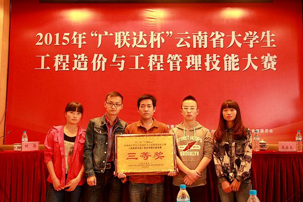 2015年“廣聯達杯”云南省大學生工程造價與工程管理技能大賽于4月17日至19日在昆明理工大學舉行,來自全省28所院校的93支代表隊分別參加工程造價技能、工程管理沙盤及招投標沙盤三項競賽。工程學院派出劉亮、丁磊兩位指導老師及劉玉翔、任思源、周淵等12名同學參賽,在眾多參賽隊伍中力克強隊勇奪三等獎。