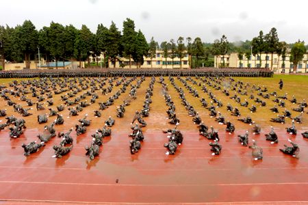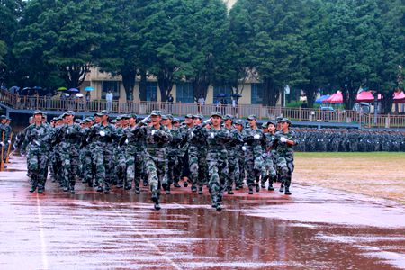 2017年9月10日上午10:00,我院2017級(jí)新生軍訓(xùn)匯報(bào)表演暨總結(jié)表彰大會(huì)在學(xué)院小哨校區(qū)田徑場(chǎng)隆重舉行。學(xué)院黨政領(lǐng)導(dǎo),相關(guān)行政部門(mén)負(fù)責(zé)人、二級(jí)學(xué)院領(lǐng)導(dǎo)、新生班主任出席了軍訓(xùn)匯演。雨下得急促稠密,冒雨軍訓(xùn),站一會(huì)兒便能把全身淋濕,新生軍訓(xùn)隊(duì)伍站在雨中,雨水順著頭發(fā)往下滴,全身濕漉漉的,但是他們依然堅(jiān)守著軍姿。