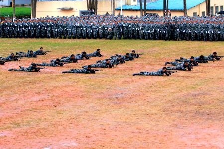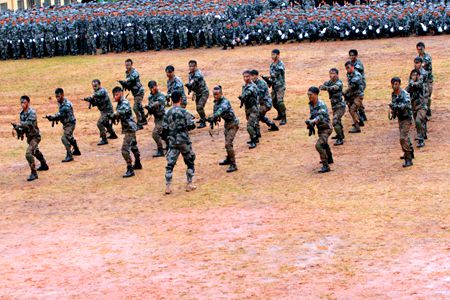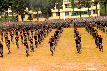 伴隨著雄壯激昂的《中國(guó)人民解放軍進(jìn)行曲》, 分列式正式開(kāi)始。新生雄赳赳、氣昂昂、聲音響亮、腳步鏗鏘通過(guò)主席臺(tái),接受與會(huì)領(lǐng)導(dǎo)和部隊(duì)首長(zhǎng)的檢閱,充分展現(xiàn)了十五天軍訓(xùn)的成果。他們堅(jiān)定的臉龐透著自信與堅(jiān)毅,標(biāo)準(zhǔn)的軍姿彰顯著青春的風(fēng)采與魅力。軍事表演課目展示中,男生軍體拳、女生匕首操、戰(zhàn)技綜合演練、女生花樣操表演科目紛紛登場(chǎng)展示。精彩的表演贏得了現(xiàn)場(chǎng)領(lǐng)導(dǎo)、老師和教官一陣又一陣熱烈的掌聲。