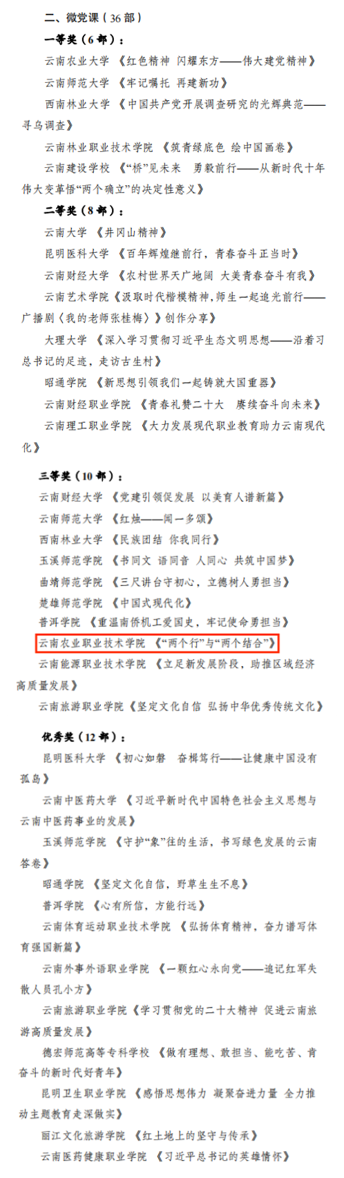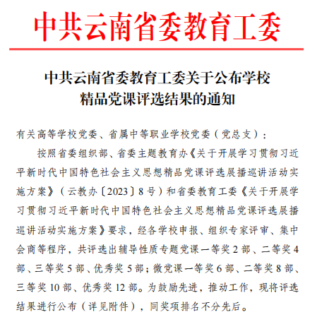 通知中心近日,中共云南省委教育工委公布學校學習貫徹習近平新時代中國特色社會主義思想精品黨課評選結果,我校馬克思主義學院龍臻老師的微黨課《“兩個行”與“兩個結合”》榮獲三等獎。