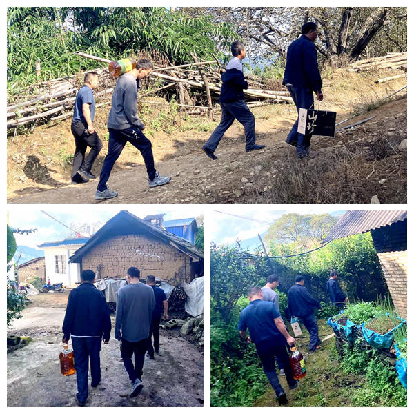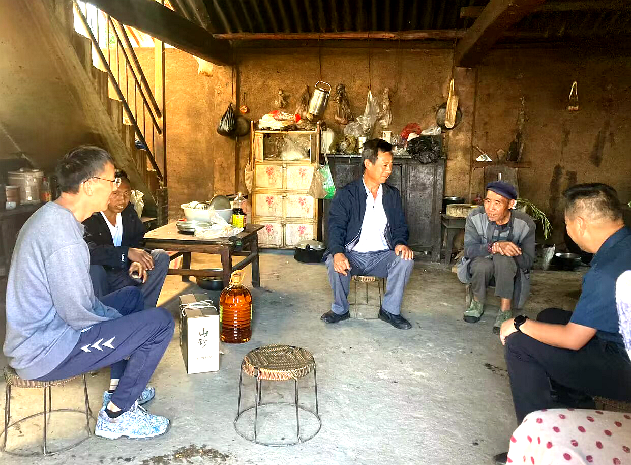 首先,駐村工作隊(duì)的同志們來(lái)到老黨員、老支書(shū)周關(guān)祥大爺?shù)募抑小V艽鬆斀衲暌呀?jīng)七十有余,行動(dòng)不便。見(jiàn)到駐村工作隊(duì)的同志們,周大爺面露微笑,眼中透著感動(dòng)。同志們?yōu)橹艽鬆斔蜕狭艘环菥臏?zhǔn)備的中秋禮包,里面裝有蜂蜜、菌菇、木耳及一桶8.5升的食用油。工作隊(duì)的同志們與周大爺熱情交流,傾聽(tīng)他生活中的點(diǎn)點(diǎn)滴滴,傳遞著黨和學(xué)院的關(guān)懷。