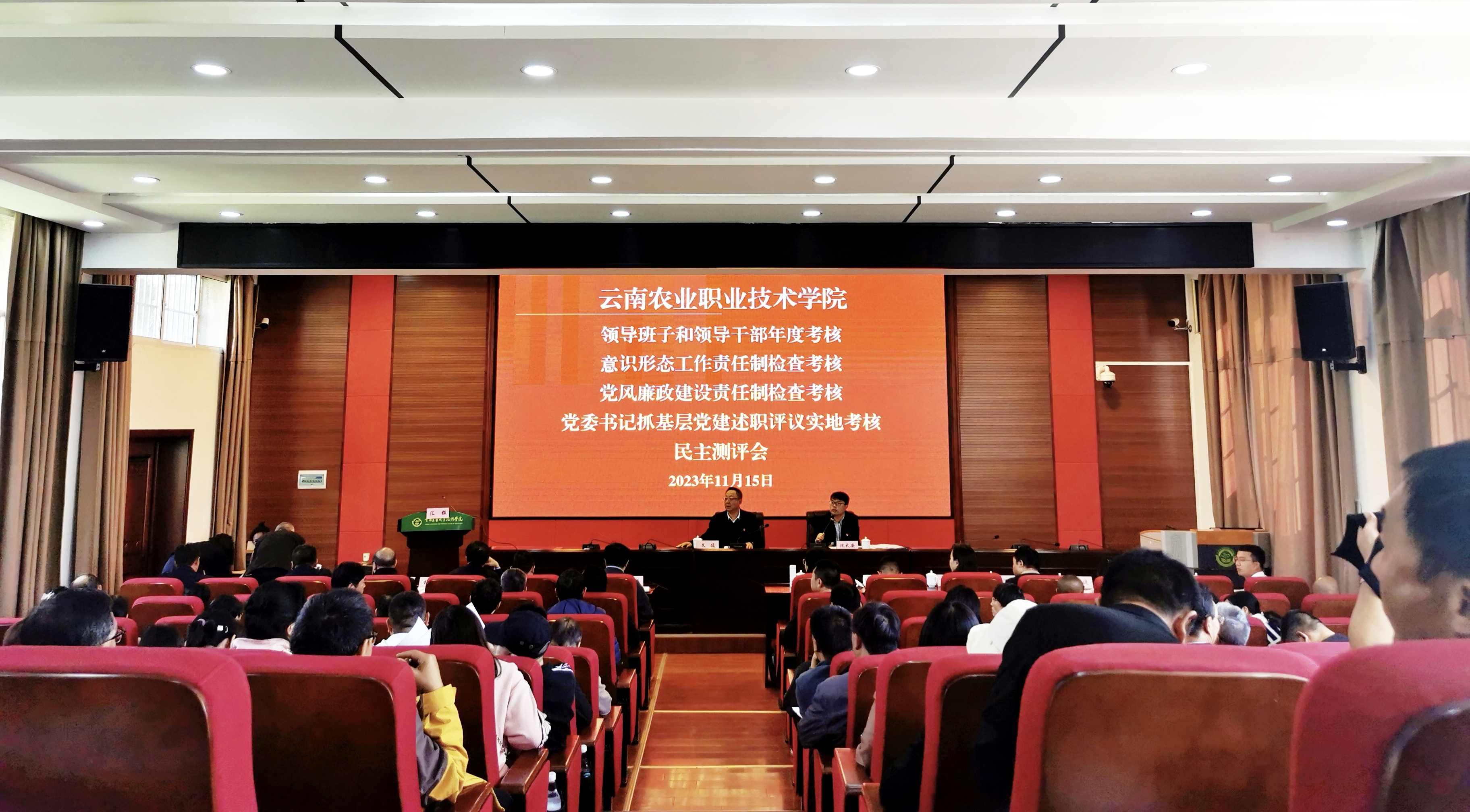 會上,黨委書記文俊代表學院領導班子述職并作2023年度落實黨風廉政建設責任制工作情況報告;黨委書記文俊、院長陳太安進行個人述責述廉。考核組組織參會人員對2023年度學校領導班子和領導干部履職情況、領導政治素質、選人用人工作和新提拔干部進行了民主測評。文俊書記在年度工作報告中指出,2023年,在省委教育工委和省教育廳黨組的正確領導下,學院黨委深入學習貫徹落實黨的二十大精神,深入推進全面從嚴治黨,扎實開展學習貫徹習近平新時代中國特色社會主義思想主題教育,聚焦融入服務“3815”戰略,認真落實全省教育發展大會精神,實施教育高質量發展三年行動計劃,以推動高質量發展的新成效檢驗主題教育成果,黨員、干部深刻領悟“兩個確立”的決定性意義、堅決做到“兩個維護”的自覺性得到新提高,推動學院高質量發展取得了新進步。他表示,下一步學院黨委將堅持以習近平新時代中國特色社會主義思想為指導,認真學習貫徹落實黨的二十大精神,用好主題教育激發的干事創業精氣神,抓牢高質量發展首要任務,落實好高質量發展三年行動計劃。以高度的政治責任意識籌備開好學院第四次黨員代表大會。深入推進圍繞重點產業的產教融合,著力高水平專業群建設瞄準鄉村振興大舞臺,持續推進社會服務,進一步提升國際交流合作影響。更好融入和服務“3815”戰略,奮力實現2024年高質量發展提質量有成效的目標,譜寫好云南教育高質量發展農職篇章。