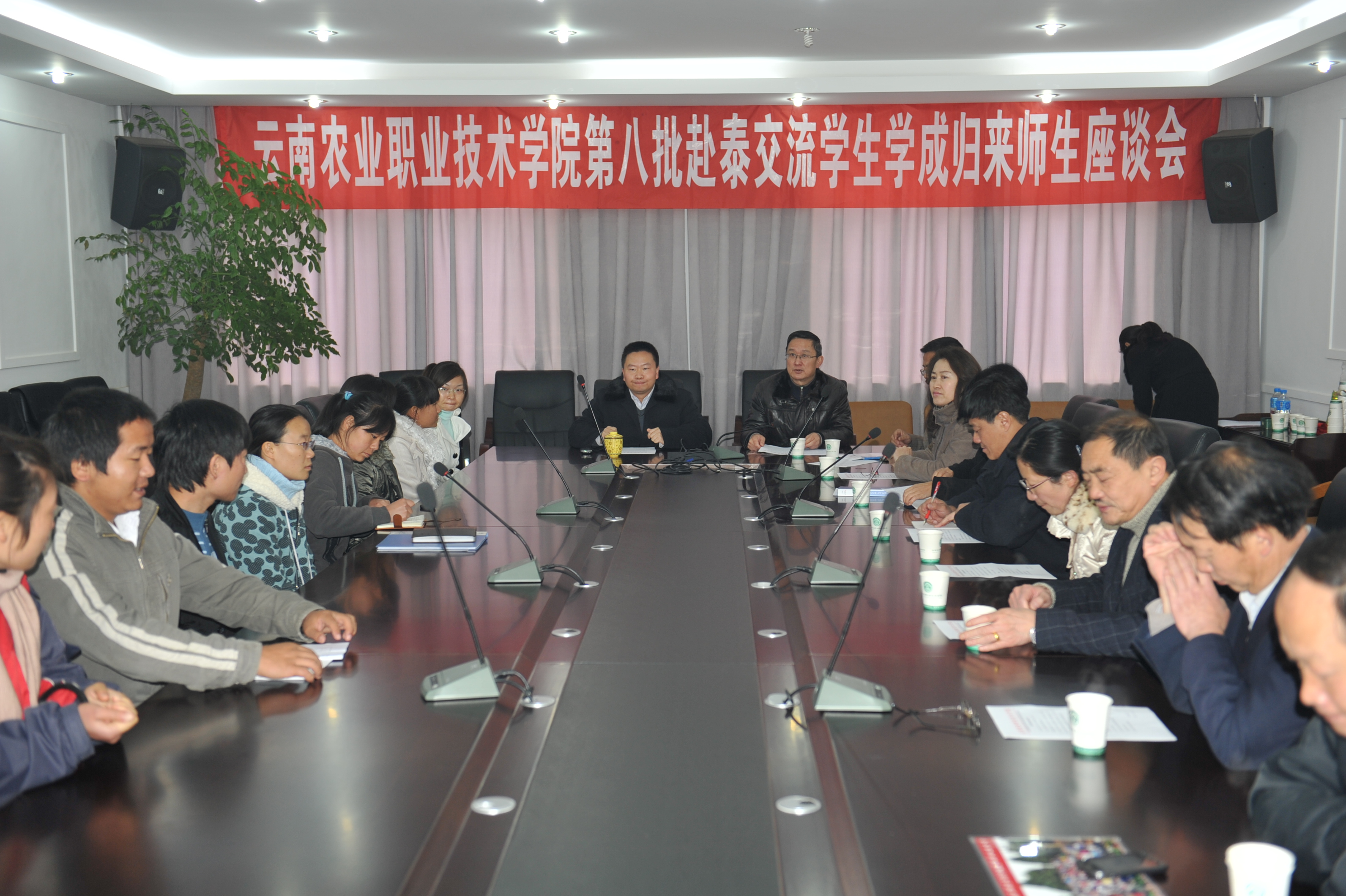 2011年12月15日,學院在小哨校區會議室舉行座談會,熱烈歡迎第八批赴泰國交流師生學成歸來,彭志遠院長出席作重要講話。黨委副書記趙剛、趙莉副院長、俞浩副院長,對外交流與合作處處長許建民、黨(院)辦主任凌軍、學生工作處處長周誠、畜牧獸醫系黨總支書記錢林東、園藝與園林工程系黨總支書記唐世凱、生物工程系黨總支書記董文紅、系主任王孟宇、管理與信息工程系黨總支書記黎紅梅、系主任譚琳、對外交流與合作處副處長趙茜、黨委宣傳部副部長蔡永生等部門負責人,以及赴泰交流學成歸來的十余名學生代表出席了座談會。趙剛副書記主持會議。