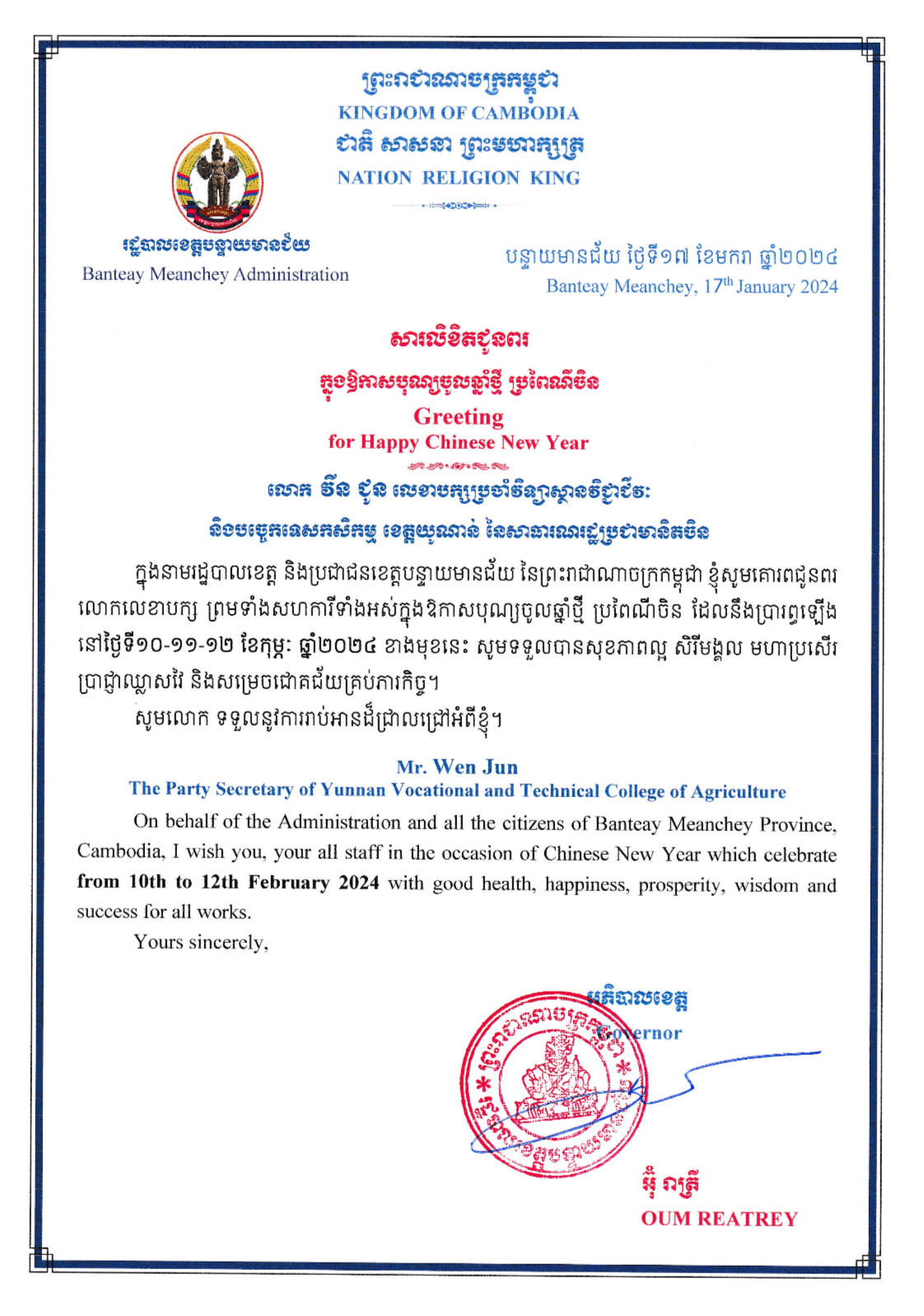 值此中國2024年傳統春節即將到來之際,我代表柬埔寨王國班迭棉吉省政府和班迭棉吉省全體人民,向書記先生和學院全體教職員工致以節日的問候!祝您們新春快樂,身體健康,萬事如意!