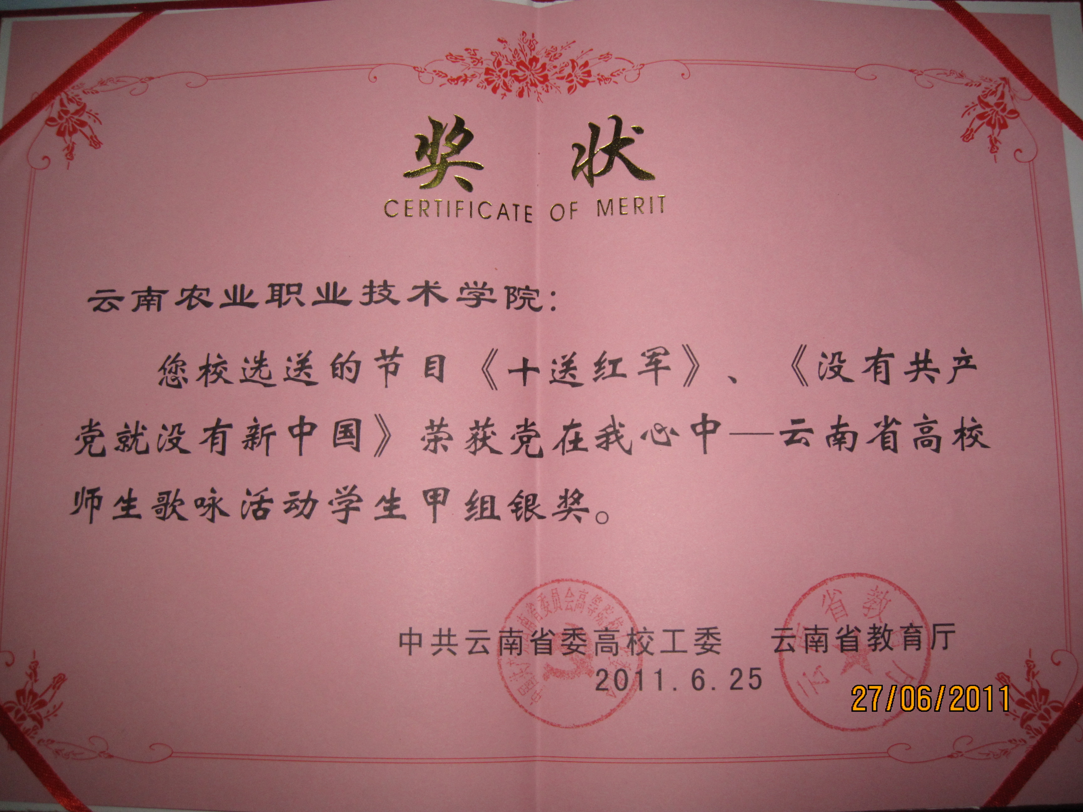 此次比賽分為學(xué)生甲組、學(xué)生乙組和教工組,我院大學(xué)生合唱團(tuán)以曲目《十送紅軍》、《過雪山草地》參加了學(xué)生甲組的比賽。經(jīng)過激勵(lì)的角逐,我院合唱團(tuán)與云南大學(xué)、云南中醫(yī)學(xué)院并列第五名,獲得此次大賽銀獎(jiǎng)!并于6月25日晚八點(diǎn)在云南廣播電視大學(xué)呈貢校區(qū)禮堂舉行了現(xiàn)場頒獎(jiǎng)晚會(huì)。