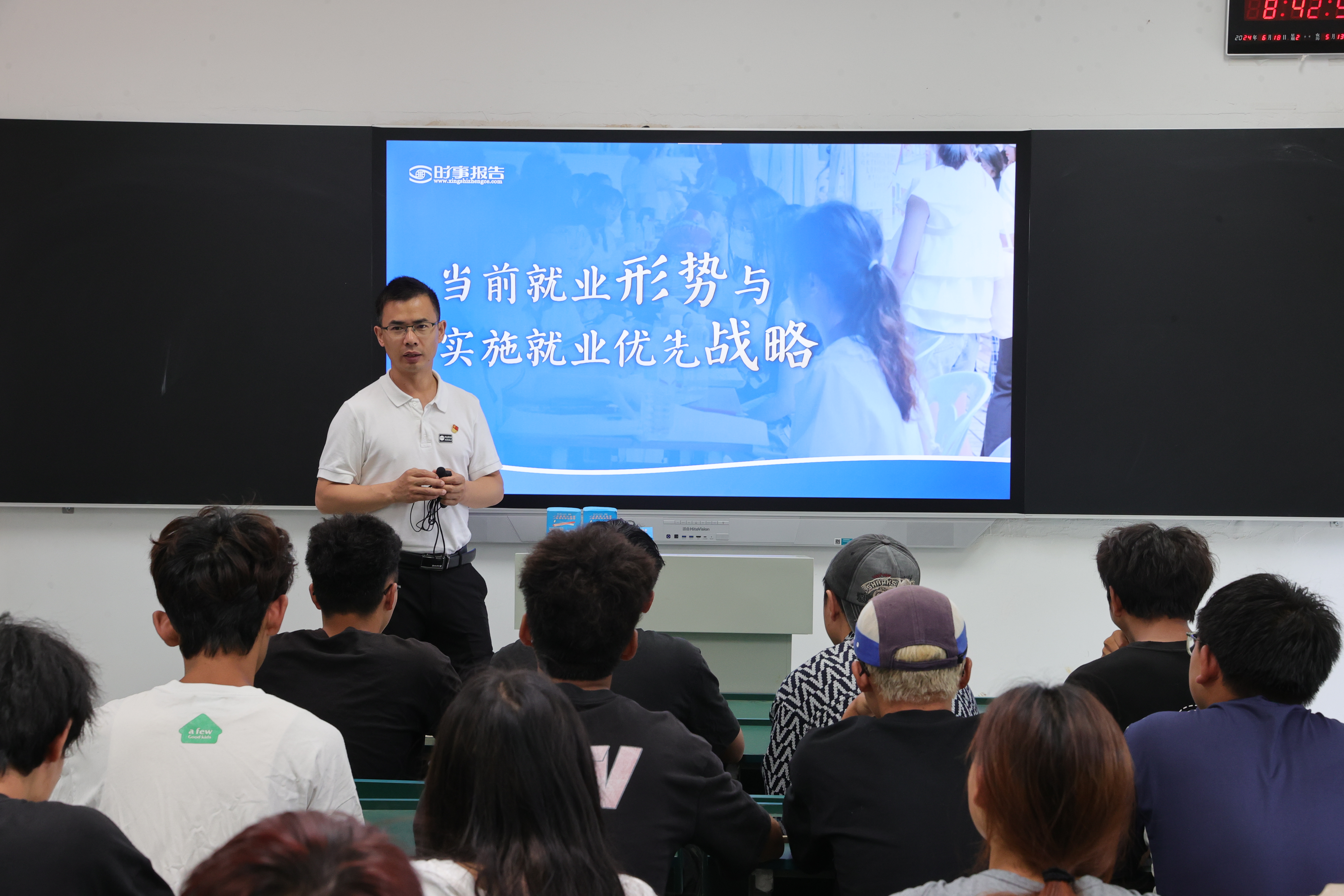 黨委副書記伍學龍、副院長楊波以《當前就業形勢與實施就業優先戰略》為主題,圍繞就業形勢總體穩定、就業壓力仍存、確保就業優先、著力拓寬渠道四個方面的內容和同學們進行了學習交流,囑咐同學們要深刻理解就業是最大的民生,感悟黨和國家將就業擺在經濟社會發展的優先位置,把穩就業提高到戰略高度通盤考慮,推動實現更加充分、更高質量的就業的決心,同時更要謀劃好自身職業規劃和職業選擇。