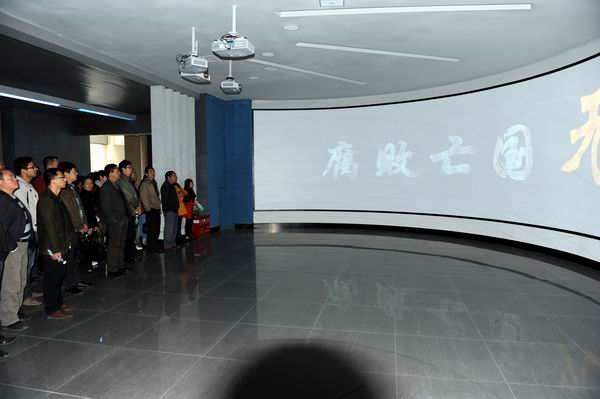 整個教育活動過程分為參觀展廳與觀看警示教育片《黑白人生》。走入參觀展廳,警示教育基地講解員引導大家經過貪腐墻,首先看到了帶有“貪”字的裂縫墻,聽到了警戒的鐘聲,警示我們的黨員干部不能以惡小而為之,心中要警鐘長鳴。接下來,講解員帶領學院領導干部著重參觀了展廳墻上的“中國古代典型腐敗案件展”、“全球各國腐敗案件展”、“全國重大腐敗案件展”、“云南省腐敗案件展”等各類專題圖片、實物展示。