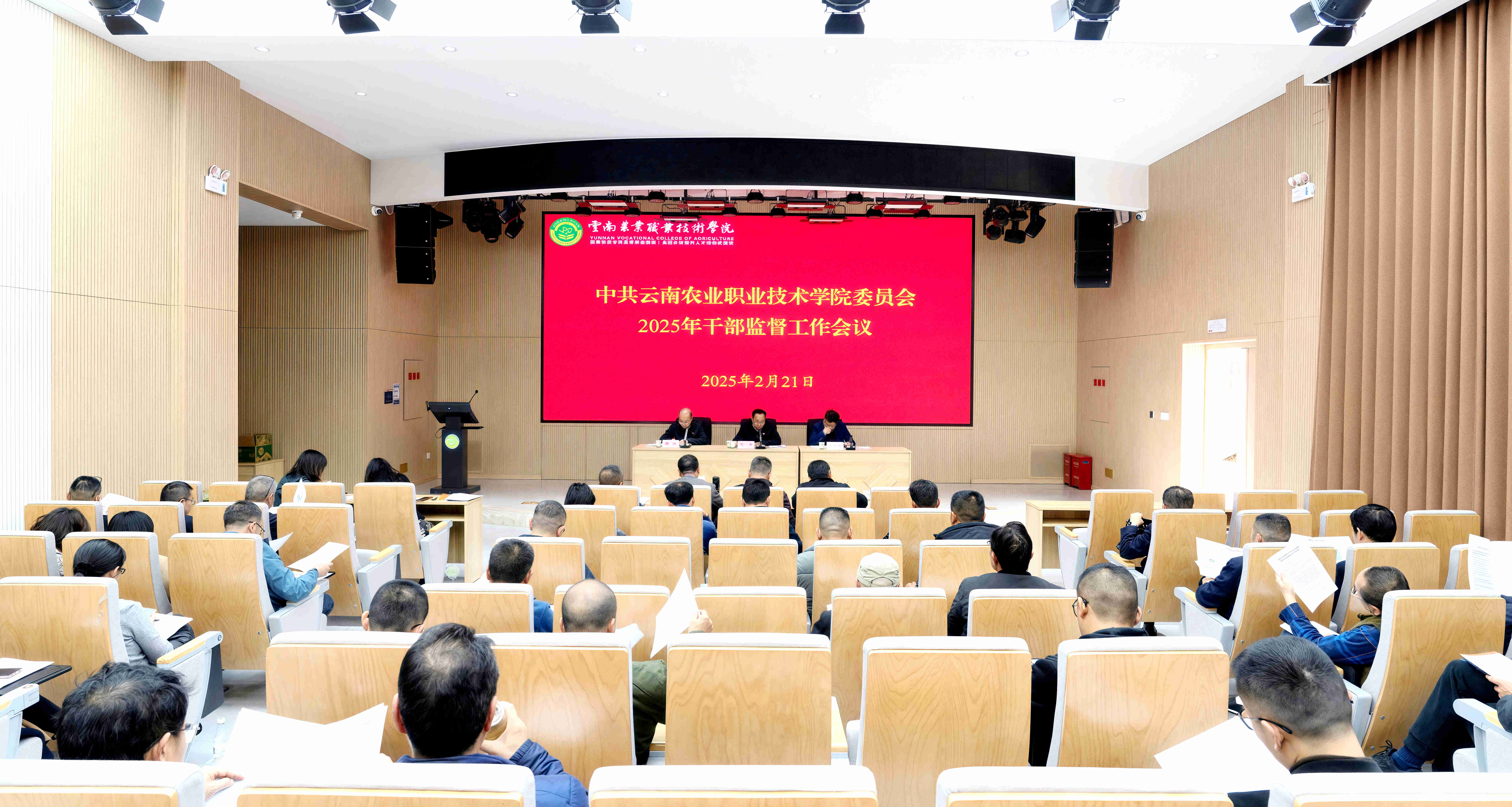 通知中心2月21日下午,學校黨委在小哨校區綜合樓一樓報告廳召開2025年干部監督工作會議。會議由黨委副書記楊波同志主持,學校副處級及以上領導干部參加。黨委書記文俊同志出席會議并講話,黨委副書記、院長陳太安出席會議并通報有關典型案例。