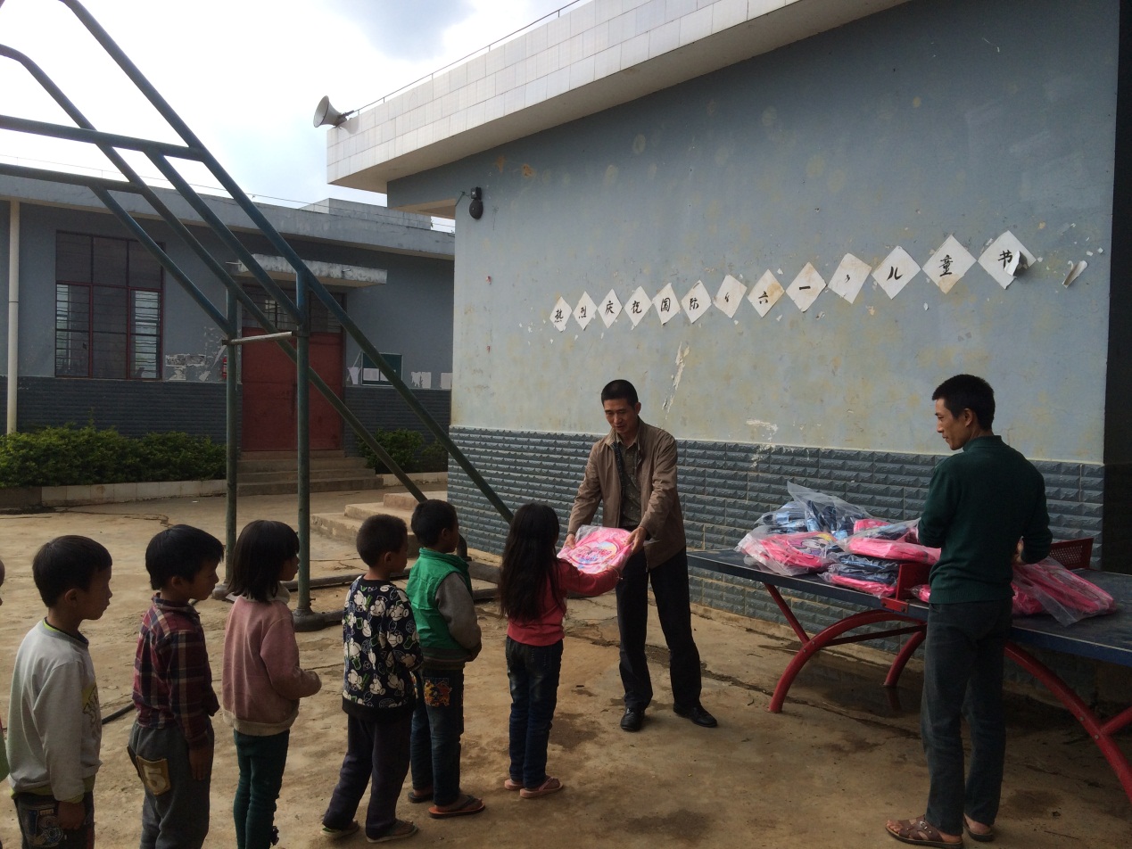 2016年4月26日,在學校及校團委的大力支持與幫助下,黃富金隊長帶領我校駐村隊員盛鵬老師、譚淑文老師、趙筱老師、陳百麗老師與龔家寨小學全體老師一起組織了云南農業(yè)職業(yè)技術學院向龔家寨小學的書包與文具的捐助活動。這些書包由校團委組織全校學生募集而來資金與物資全力支持。