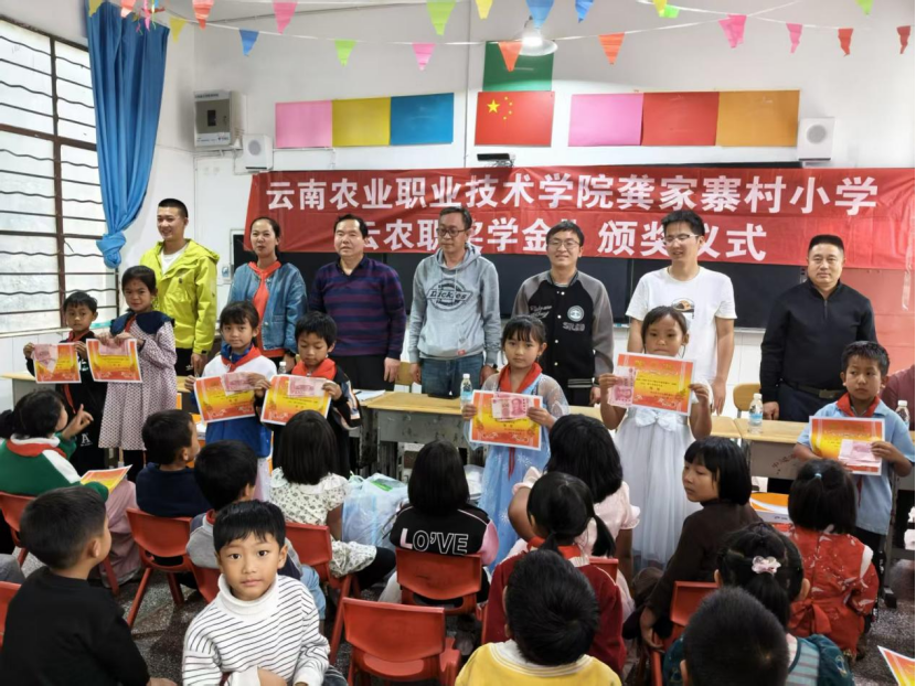 駐村工作隊代表學校向獲得"云農職獎學金"的同學頒發獎金