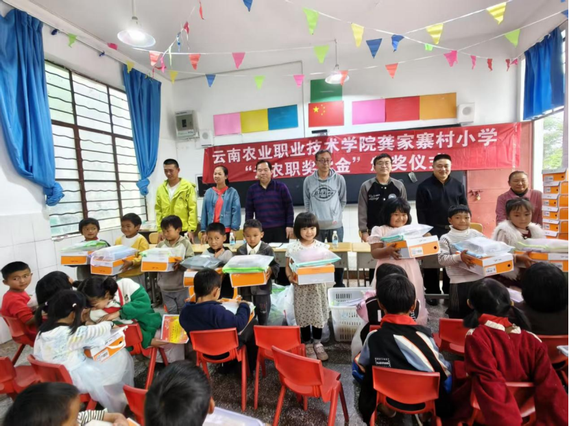 5月29日,在第76個“六一”國際兒童節來臨之際,在龔家寨小學舉行了隆重的“云農職獎學金”頒獎儀式。駐村工作隊的五位教師代表學校向獲得一、二、三等獎的同學頒發了獎金,并向全體學生發放了慰問品。這一舉措體現了學校對教育事業的關心和支持以及對孩子們的關愛和期望。