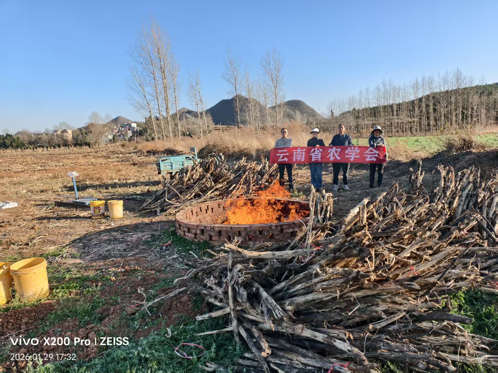 活動針對當地烤煙秋收后秸稈處理難題,開展秸稈集中焚燒示范。秸稈焚燒成生物炭后還田,改善土壤團粒結構從而改良土壤,以實現“三化”(減量化、無害化、資源化)利用。冬末的雷營村寒意未消,廣袤的田地里,一堆堆煙稈匍匐著、簇擁著,似乎比其他地方的煙稈更粗大,有泡水后曬干的,成深灰色;有堆捂后曬干的,成黑色;有自然風干的,成斑白色。田邊地角是一座先前建設好的、由紅磚砌成的特殊窯爐,這便是科技特派員團隊自主設計并建造的火焰幕磚窯。這次活動不但要焚燒完這片田地里的秸稈,還要分別取樣回去做出研究分析。
