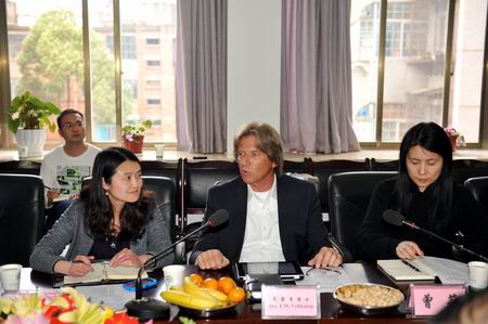 何明東副院長首先致辭,對范康普博士一行再次光臨我校表示熱烈歡迎,并從四個方面介紹了我校辦學優勢和特色:第一,我院有優良的區位優勢和巨大發展潛力。學院位于中國西南與東南亞接壤處,位于素有“動物王國”、“植物王國”之稱的云南省,動植物資源十分豐富,未來發展有重要基礎;第二,我院有悠久的歷史沿革,從建校至今的108年里,得到歷屆政府的高度重視與大力支持;第三,我院有廣泛深度的行業合作優勢。學院共培養了5萬多名學生,大多數都在從事與農業相關的工作,有著厚實的農業推廣基礎;第四,我院有專業化的辦學模式,適度的辦學規模和科學的辦學結構。我院現有5000多名學生,30多個專業中,84%的專業是農學類專業。何副院長同時指出,農業是當今社會發展的主要問題。農業職業教育面臨如何提高辦學水平、面臨世界農業產業化等一系列問題,需要在技術、管理、人員培訓等方面進行新的探索和不斷提高。因此,雙方有著良好的合作空間。