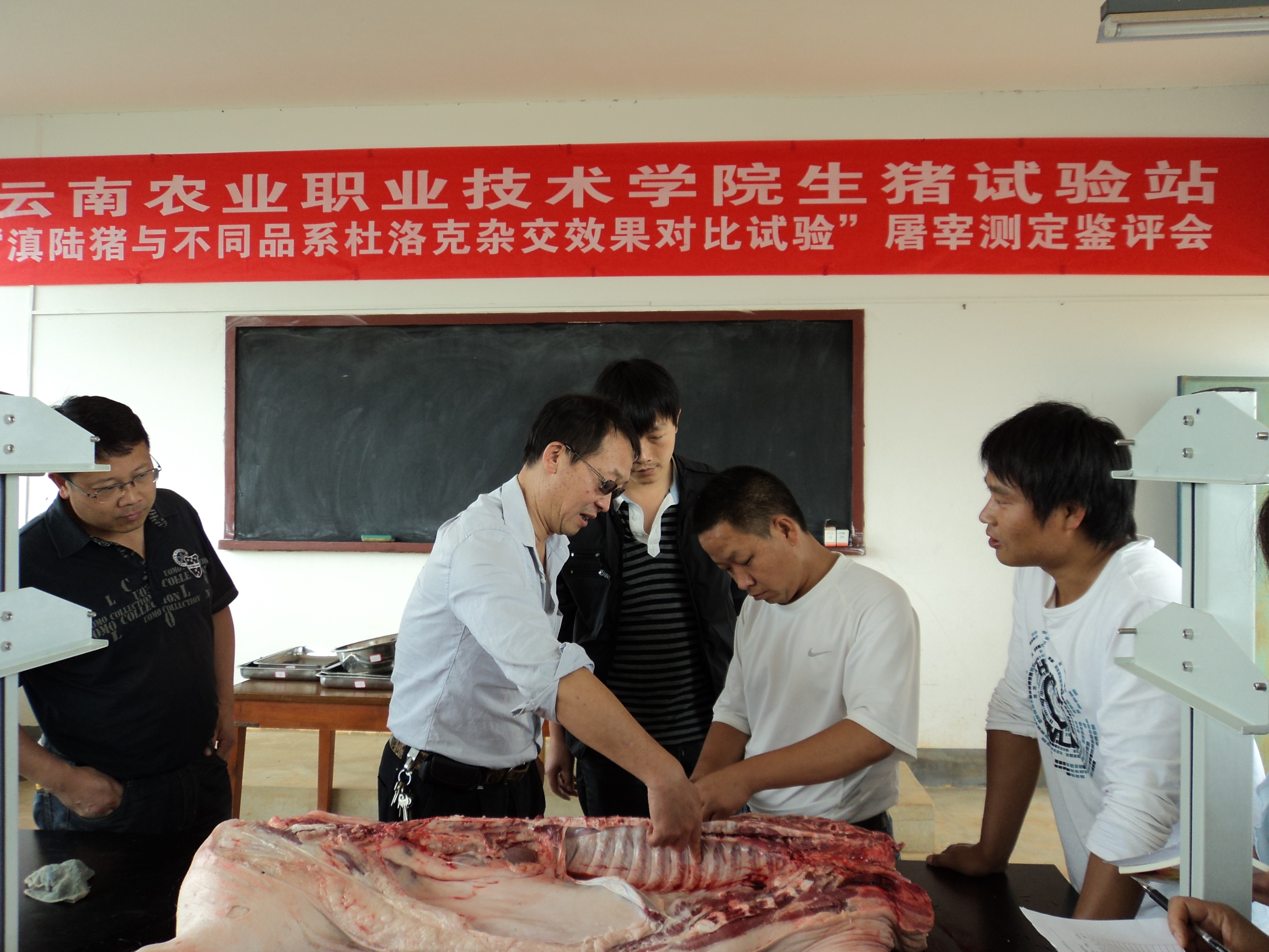 通知中心2011年6月28日,云南農業職業技術學院生豬綜合試驗站“滇陸豬與不同品系杜洛克雜交效果對比試驗”屠宰測定鑒評會在小哨校區舉行。云南省農業廳孫海清副廳長、云南省生豬體系首席科學家魯紹雄教授一行蒞臨現場指導工作。