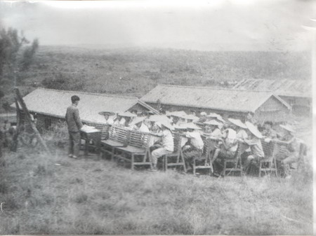 師生們在荒山上邊建學(xué)校邊上課。帳篷里光線太暗,他們就把空曠平地當(dāng)做教室:教師傳授知識的聲音隨花莊河的清泉一起潺潺流淌;而那些斗笠,見證了一份事業(yè)的開拓,也見證了知識的力量。