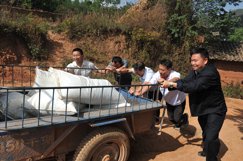 早上9:00,崎嶇的山路上留下了彭院長一行的身影。彭院長告訴大家:“我們一定要盡早趕到農(nóng)戶家中,盡快把化肥送到他們手里,去晚了他們可能已經(jīng)下地耕作去了。”本著一切從簡,不給基層增加負(fù)擔(dān)的想法,彭院長決定此次行程不驚動當(dāng)?shù)卣?,直接去農(nóng)戶家里解決實(shí)際問題。由于去到農(nóng)戶家里的小路很陡,且坑坑洼洼,裝化肥的拖拉機(jī)爬不上去。于是,彭院長便下車帶領(lǐng)大家一起把拖拉機(jī)推行一段。