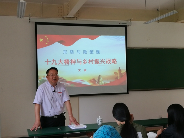 通知中心2018年7月3日下午,文俊院長走進課堂,走上講臺,為學生上了一堂生動的以“黨的十九大精神和鄉村振興戰略”為主題的形勢與政策課。