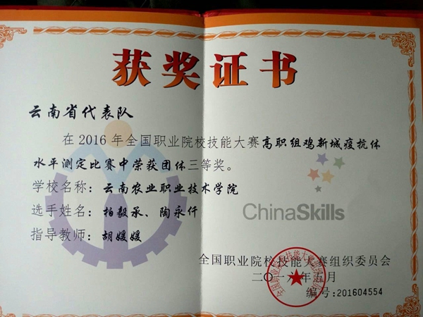 本次大賽由農(nóng)業(yè)部與教育部主辦,江蘇省農(nóng)業(yè)委員會(huì)、江蘇省教育廳承辦,江蘇農(nóng)林職業(yè)技術(shù)學(xué)院等單位協(xié)辦。該項(xiàng)目全國(guó)共有63個(gè)代表隊(duì)126名選手參賽,設(shè)一等獎(jiǎng)6個(gè),二等獎(jiǎng)12個(gè),三等獎(jiǎng)18個(gè)。這是我校在全國(guó)職業(yè)技能大賽中第三次在此項(xiàng)目獲得佳績(jī)。(教務(wù)處、畜牧獸醫(yī)學(xué)院供稿)