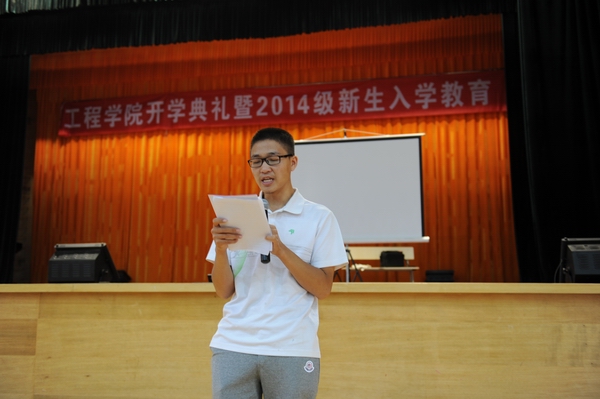 2014級工程造價三班的江思宏同學代表全體新生發言。他表示新校園新起點,在未來三年的時光里,將以先賢為坐標,牢記領導、老師和父母的殷切希望,盡快適應新的大學生活,樹立遠大的目標,努力提高自己的綜合素質,熟練掌握專業知識。