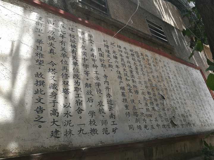 首先,大家參觀了位于昆明市華山東路的大德寺雙塔,1930年至1937年云南省立第一農業學校在雙塔寺辦學,為學校辦學舊址。大德寺始建于1469年,曾經是昆明較大的佛寺之一,過去的大德寺與華山寺相對,清人朱筱園有《雙塔寺》詩云:“古寺嵌螺峰,出奇五華外。干霄兩浮圖,俯受亂山拜。城市幾劫灰,矗立終不壞。”大德寺雙塔始建于明成化三十年,現在,深藏在高高水泥建筑群中的雙塔寺,雙塔如故,寺已無存。昔日壯美的雙塔,如今掩藏在高大的水泥建筑物中,顯得些許蒼涼,雙塔與它身邊的古柏靜靜佇立,見證歷史滄桑,歲月風雨。