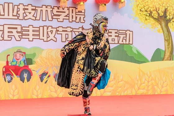 崔金賦書記和文俊院長共同為蠶桑禮堂揭牌,并由文院長宣布農耕文化廣場正式啟用。本次文藝活動節目內容豐富,既突出豐收的喜悅和傳統的魅力,如非物質文化遺產“彝族跳菜舞”、川劇“變臉”;同時,也充分展現了現代元素,如現代歌舞“好運來”“越來越好”“陽光路上”以及魔術表演等。既有專業團隊演出,也有師生同臺合作;既是慶祝豐收的文藝表演,也是《中國傳統文化》課程學生體驗戶外實踐課程的嘗試。園藝園林學院黨總支陶艷芳書記與學生合作的神農氏祭拜儀式和農耕文化廣場墻壁書頁經典誦讀都充分體現了學院傳統文化的教學創新。互動游戲“蒙眼運糧食”更體現出以農為特色的團隊合作,游戲中蘊含由農業豐收上升到精神豐收的元素,讓學生在娛樂中升華。
