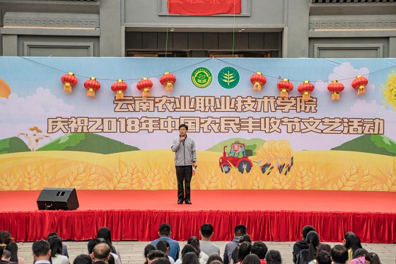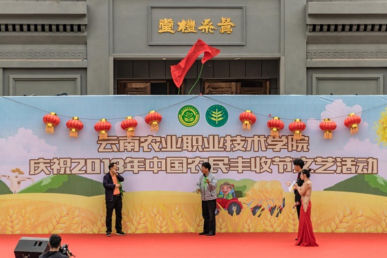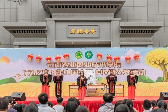 9月20日上午10:30,我院在新落成的農耕文化廣場舉行了慶祝2018年中國農民豐收節文藝活動,黨委書記崔金賦,院長文俊,副院長趙鴻陽、楊波、田應華,紀委書記馮志宏出席本次活動,廣大師生員工約200余人參加慶祝活動。首先,由崔書記致辭。他向廣大師生員工指出,我們歡聚一起慶祝首屆中國農民豐收節,寄托對“三農”的深厚感情,表達永遠不忘以農為主的本色。同時,崔書記強調蠶桑禮堂揭牌和農耕文化廣場啟用是我院慶祝中國農民豐收節的重要獻禮。蠶桑禮堂的揭牌時刻提醒我們要秉承學院前身——云南蠶桑學堂的開創精神,秉承團結包容開放的絲路精神,融入學院發展過程,融入個人成長進步;農耕文化廣場的啟用是我院傳承百年歷史、培養優秀人才、建設一流院校、發展現代農業的重要載體,通過開發利用好豐富多彩的農耕文化資源,春風化雨,潤物無聲,從農業起步,靠農業發展,為農業奉獻,實現自身價值。