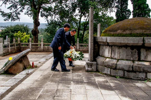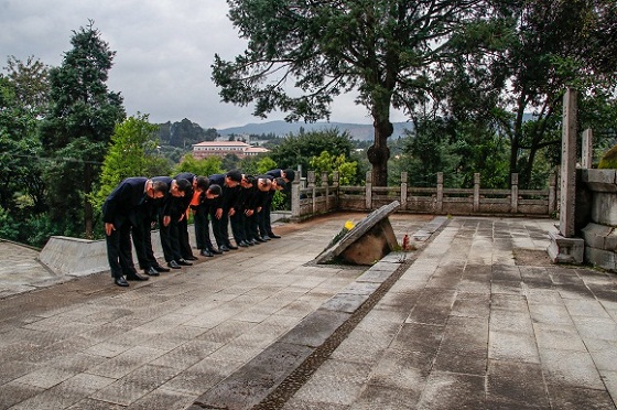 告別朱德舊居紀念館,領導班子成員懷著莊嚴肅穆的心情來到黑龍潭革命烈士陵園,這里長眠著王德三、吳澄、馬登云、王復生、張舫、劉平楷六位為中國人民的解放事業英勇獻身的革命先烈。拾級而上,道路兩旁巍然矗立的蒼松翠柏象征了革命烈士堅強不屈的革命精神萬古流芳。崔金賦書記、文俊院長代表新一屆黨委班子向王德三烈士墓敬獻了花籃,全體委員在紀委書記馮志宏同志帶領下向烈士默哀并深深三鞠躬,表達對革命先烈的深切緬懷和無限敬仰。崔金賦書記懷著激動的心情,即興賦詩一首頌揚烈士精神:“風雨蒼黃九十年,林坡起冢葬英賢。離家千里歸成夢,友共三生誓化煙。水影山光紅日下,松音溪曲白云邊。一腔大義垂青史,忠骨貞碑伴永眠。”