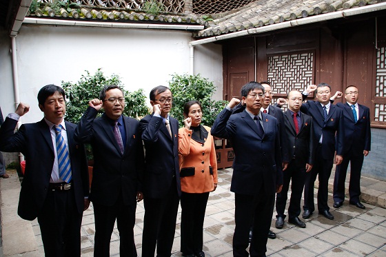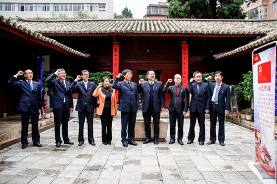 黨委領導班子成員首先來到位于平政街節孝巷的中共云南地下黨建黨舊址,參觀云南近代波瀾壯闊的革命斗爭歷史,深切緬懷先烈的豐功偉績。在我校教師、中共云南省委第一任省委書記王德三烈士的塑像前,面對鮮艷的中國共產黨黨旗,黨委領導班子成員一起重溫入黨誓詞。在黨委書記崔金賦同志領誓下,黨委委員們舉起右拳,鄭重宣誓,錚錚誓言久久回蕩。